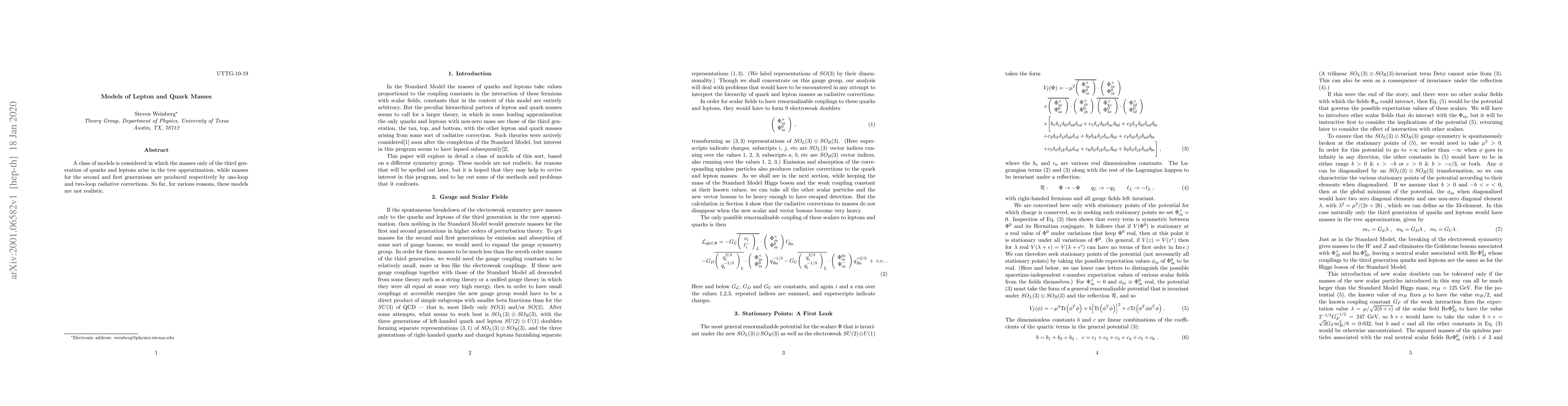 A class of models is considered in which the masses only of the third generation of quarks and leptons arise in the tree approximation, while masses for the second and first generations are produced respectively by one-loop and two-loop radiative corrections. So far, for various reasons, these models are not realistic.