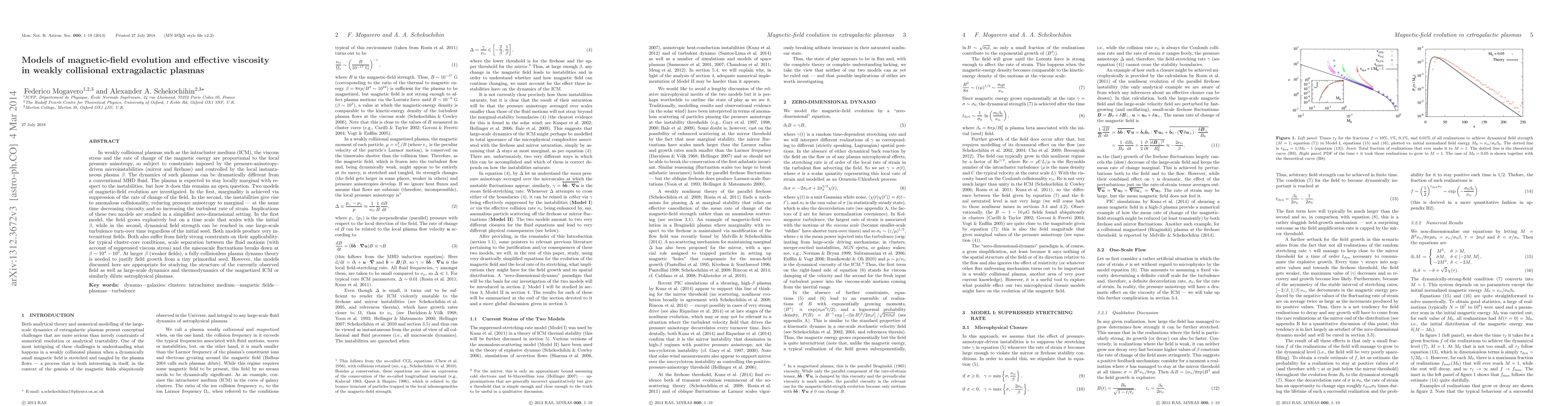 In weakly collisional extragalactic plasmas such as the intracluster medium, viscous stress and the rate of change of the magnetic-field strength are proportional to the local pressure anisotropy, so subject to constraints imposed by the pressure-anisotropy-driven mirror and firehose instabilities and controlled by the local instantaneous plasma beta. The dynamics of such plasmas is dramatically different from a conventional MHD fluid. The plasma is expected to stay locally in a marginal state with respect to the instabilities, but how it does this is an open question. Two models of magnetic-field evolution are investigated. In the first, marginality is achieved via suppression of the rate of change of the field. In the second, the instabilities give rise to anomalous collisionality, reducing pressure anisotropy to marginal - at the same time decreasing viscosity and so increasing the turbulent rate of strain. Implications of these models are studied in a simplified 0D setting. In the first model, the field grows explosively but on a time scale that scales with initial beta, while in the second, dynamical field strength can be reached in one large-scale turbulence turn-over time regardless of the initial seed. Both models produce very intermittent fields. Both also suffer from strong constraints on their applicability: for typical cluster-core conditions, scale separation between the fluid motions and the microscale fluctuations breaks down at beta~10^5-10^4. At larger beta (weaker fields), a fully collisionless plasma dynamo theory is needed in order to justify the growth of the field from a tiny primordial seed. However, the models discussed here are appropriate for studying the structure of the currently observed field as well as large-scale dynamics and thermodynamics of the magnetized ICM or similarly dilute astrophysical plasmas.