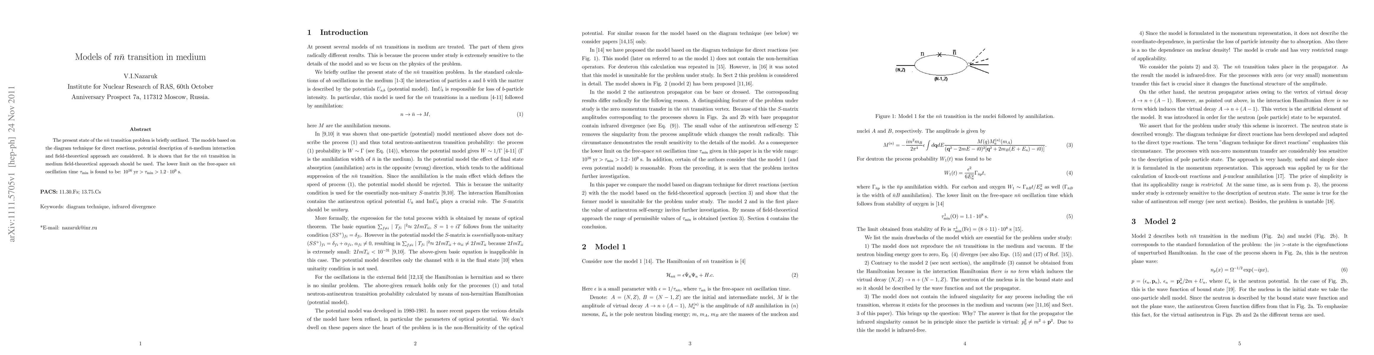The present state of the $n\bar{n}$ transition problem is briefly outlined. The models based on the diagram technique for direct reactions, potential description of $\bar{n}$-medium interaction and field-theoretical approach are considered. It is shown that for the $n\bar{n}$ transition in medium field-theoretical approach should be used. The lower limit on the free-space $n\bar{n}$ oscillation time $\tau_{{\rm min}}$ is found to be: $10^{16}\; {\rm yr}>\tau_{{\rm min}}>1.2\cdot 10^{9}\; {\rm s}$.