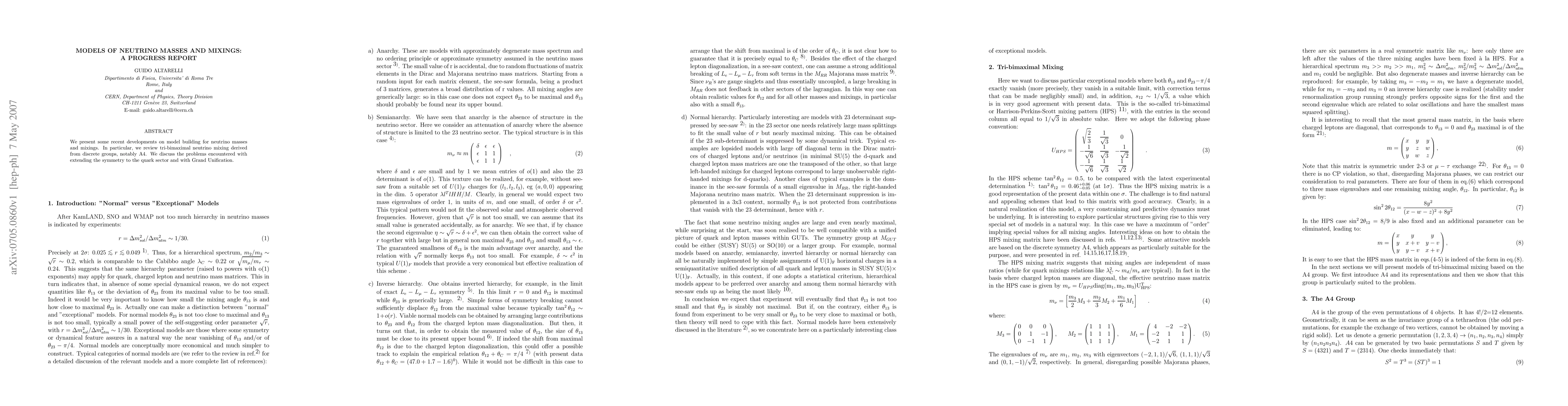 Summary: This paper reviews recent advancements in constructing models for neutrino masses and mixings, focusing on tri-bimaximal mixing originating from the A4 symmetry group. It addresses challenges in extending this symmetry to the quark sector and its implications for Grand Unification theories.