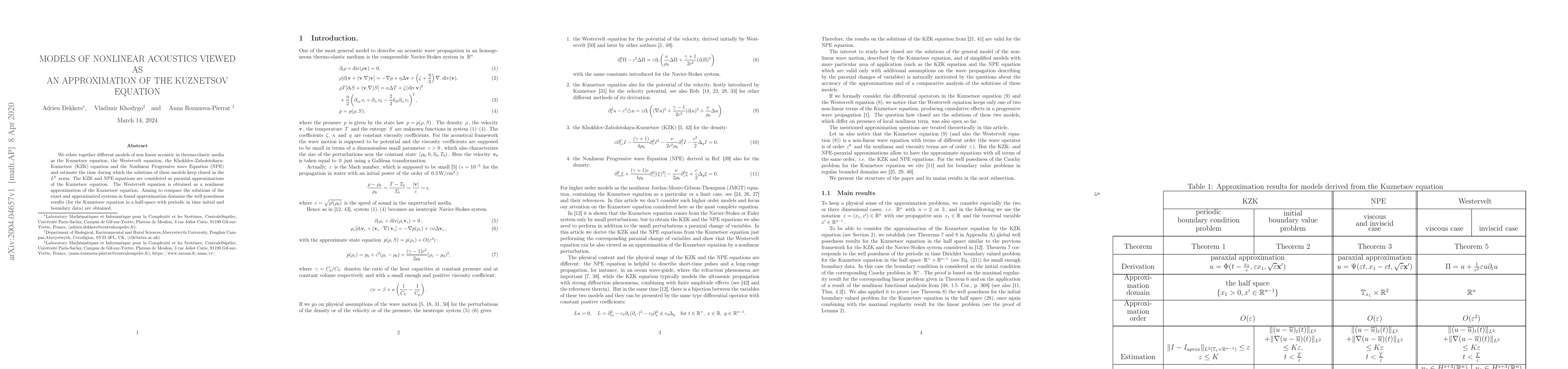 We relate together different models of non linear acoustic in thermo-ellastic media as the Kuznetsov equation, the Westervelt equation, the Khokhlov-Zabolotskaya-Kuznetsov (KZK) equation and the Nonlinear Progressive wave Equation (NPE) and estimate the time during which the solutions of these models keep closed in the L 2 norm. The KZK and NPE equations are considered as paraxial approximations of the Kuznetsov equation. The Westervelt equation is obtained as a nonlinear approximation of the Kuznetsov equation. Aiming to compare the solutions of the exact and approximated systems in found approximation domains the well-posedness results (for the Kuznetsov equation in a half-space with periodic in time initial and boundary data) are obtained.