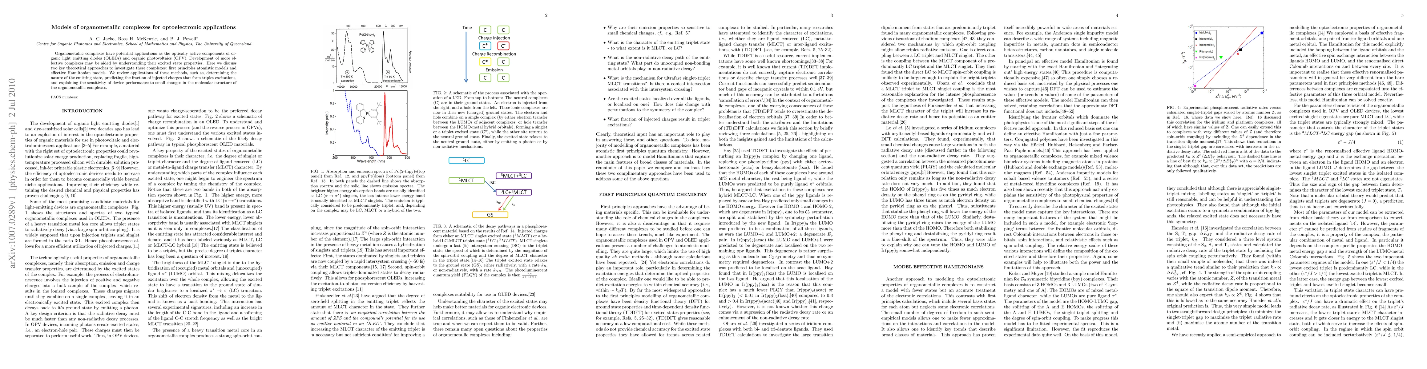 This paper explores theoretical models for organometallic complexes used in optoelectronic applications like OLEDs and OPVs, focusing on first principles atomistic and effective Hamiltonian models to understand their excited state properties and optimize device performance.