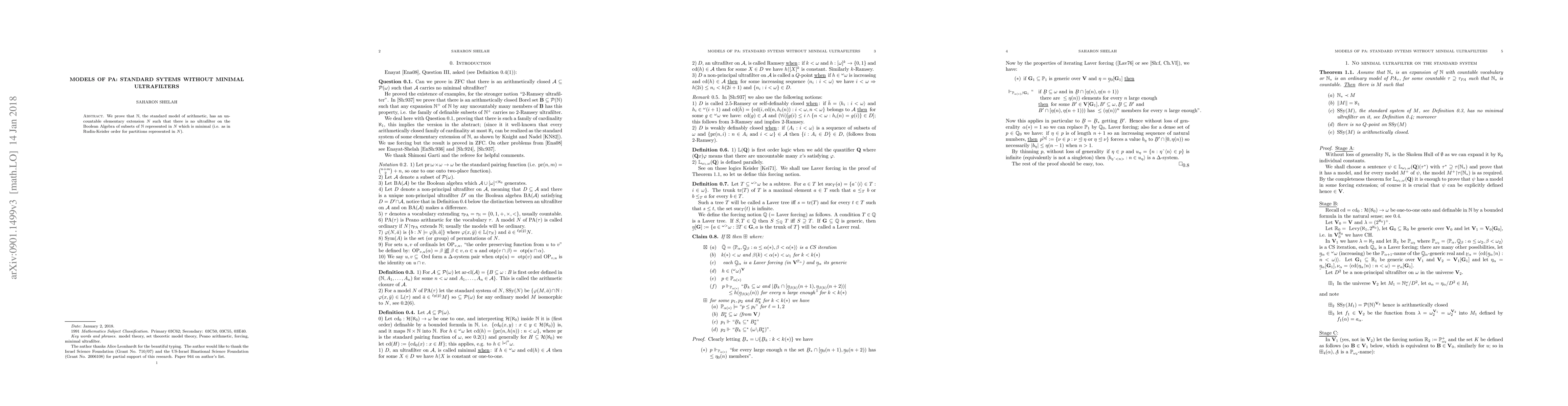This paper demonstrates that the standard model of arithmetic, bold N, can be extended to an uncountable elementary model N without any minimal ultrafilters on its Boolean Algebra of subsets, as defined by Rudin-Keisler order for partitions.