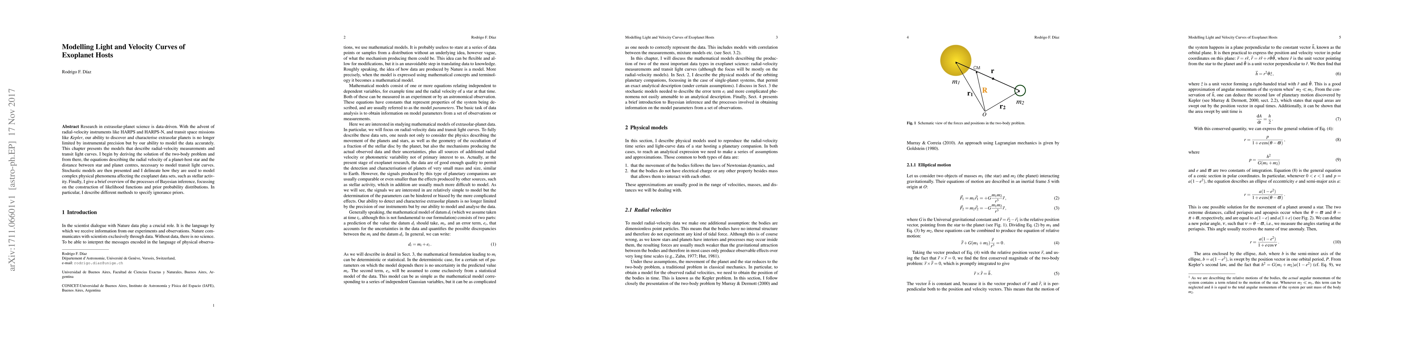 Research in extrasolar-planet science is data-driven. With the advent of radial-velocity instruments like HARPS and HARPS-N, and transit space missions like Kepler, our ability to discover and characterise extrasolar planets is no longer limited by instrumental precision but by our ability to model the data accurately. This chapter presents the models that describe radial-velocity measurements and transit light curves. I begin by deriving the solution of the two-body problem and from there, the equations describing the radial velocity of a planet-host star and the distance between star and planet centres, necessary to model transit light curves. Stochastic models are then presented and I delineate how they are used to model complex physical phenomena affecting the exoplanet data sets, such as stellar activity. Finally, I give a brief overview of the processes of Bayesian inference, focussing on the construction of likelihood functions and prior probability distributions. In particular, I describe different methods to specify ignorance priors.