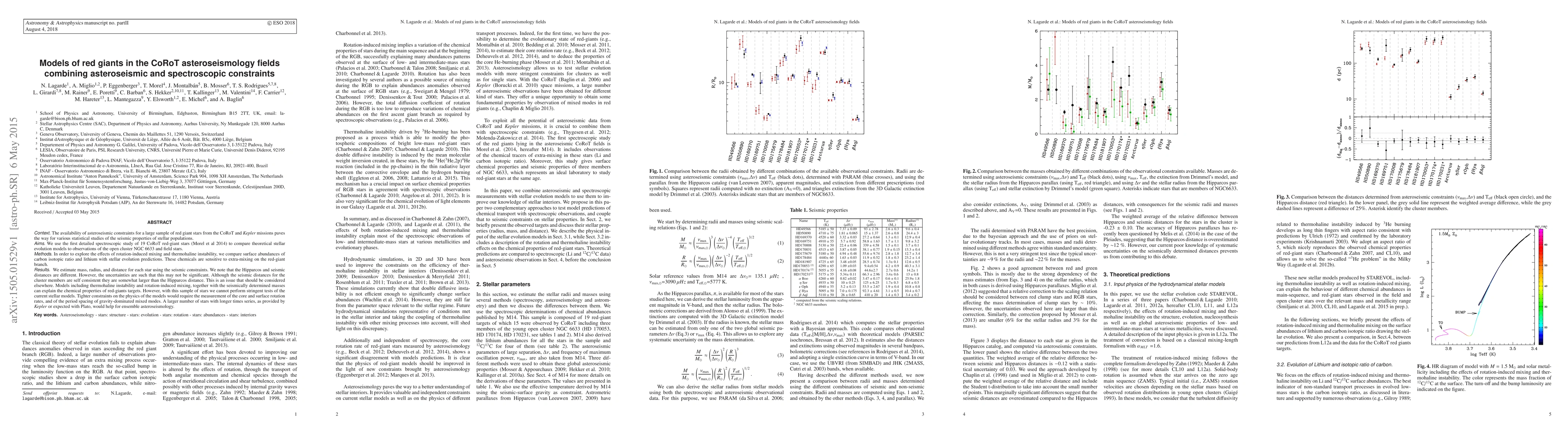 This paper combines asteroseismic and spectroscopic data to refine models of red giants observed in CoRoT fields, finding that models incorporating thermohaline instability and rotation-induced mixing can explain observed chemical properties, though the seismic distances differ from Hipparcos values. Larger datasets are needed for more stringent model testing.