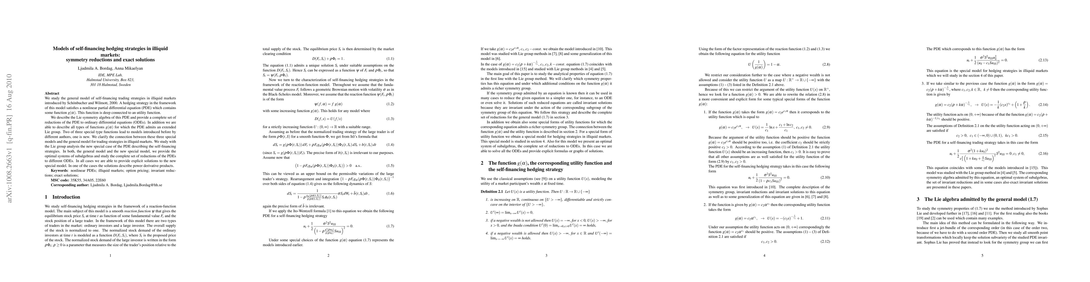 This paper explores self-financing hedging strategies for illiquid markets using a nonlinear PDE framework, employing Lie symmetry algebra to reduce the PDE to ODEs and providing exact solutions. It identifies new special cases and clarifies their connections to previously known models, offering explicit solutions for power derivative products.