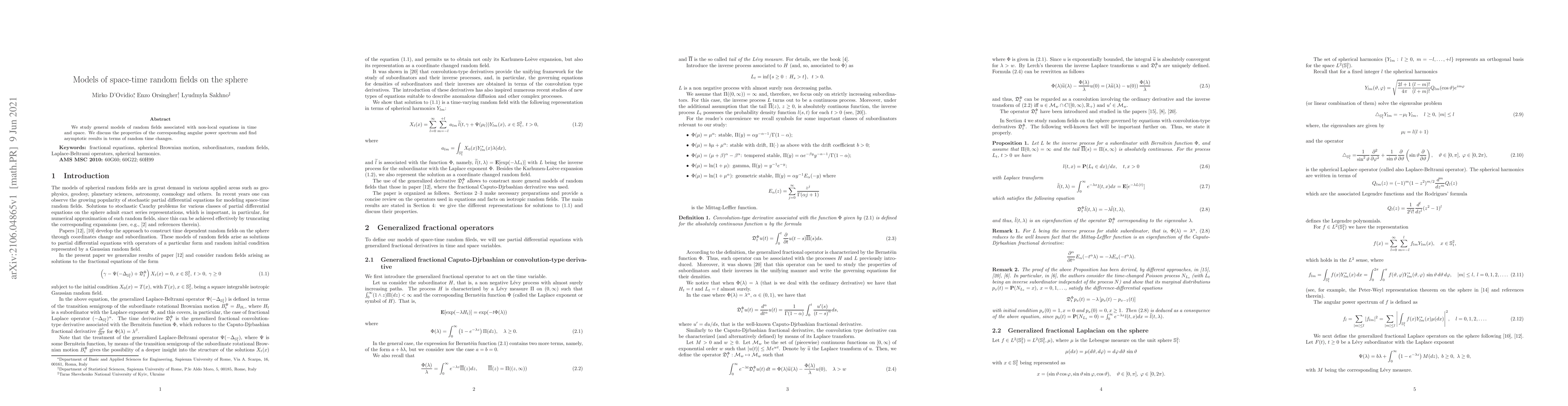 We study general models of random fields associated with non-local equations in time and space. We discuss the properties of the corresponding angular power spectrum and find asymptotic results in terms of random time changes.