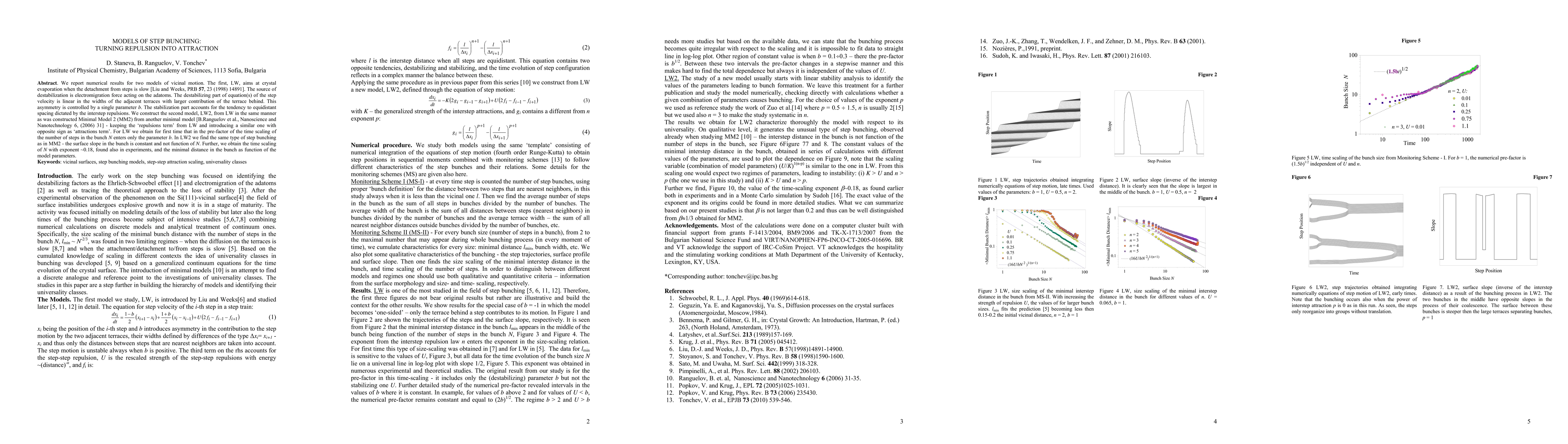 We report numerical results for two models of vicinal motion. The first, LW, aims at crystal evaporation when the detachment from steps is slow [Liu and Weeks, PRB 57, 23 (1998) 14891]. The source of destabilization is electromigration force acting on the adatoms. The destabilizing part of equation(s) of the step velocity is linear in the widths of the adjacent terraces with larger contribution of the terrace behind. This asymmetry is controlled by a single parameter b. The stabilization part accounts for the tendency to equidistant spacing dictated by the interstep repulsions. We construct the second model, LW2, from LW in the same manner as was constructed Minimal Model 2 (MM2) from another minimal model [B.Ranguelov et al., Nanoscience and Nanotechnology 6, (2006) 31] - keeping the 'repulsions term' from LW and introducing a similar one with opposite sign as 'attractions term'. For LW we obtain for first time that in the pre-factor of the time scaling of the number of steps in the bunch N enters only the parameter b. In LW2 we find the same type of step bunching as in MM2 - the surface slope in the bunch is constant and not function of N. Further, we obtain the time scaling of N with exponent ~0.18, found also in experiments, and the minimal distance in the bunch as function of the model parameters.