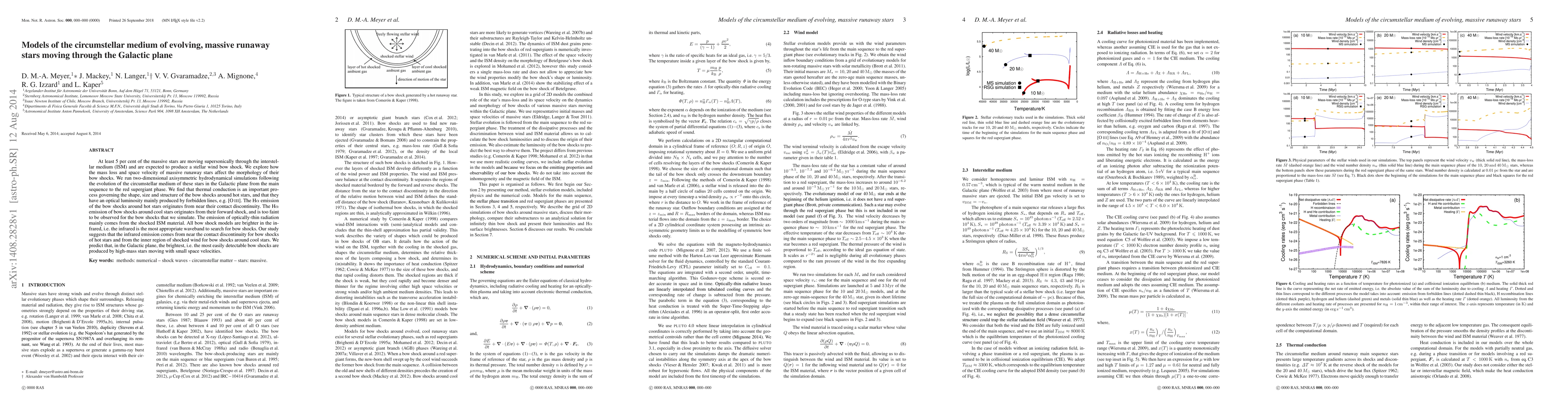 This paper investigates the hydrodynamical evolution of bow shocks formed by massive runaway stars moving through the Galactic plane, finding that thermal conduction significantly influences their shape and size. Infrared is identified as the optimal waveband for detecting these bow shocks, with different emission origins for hot and cool stars.