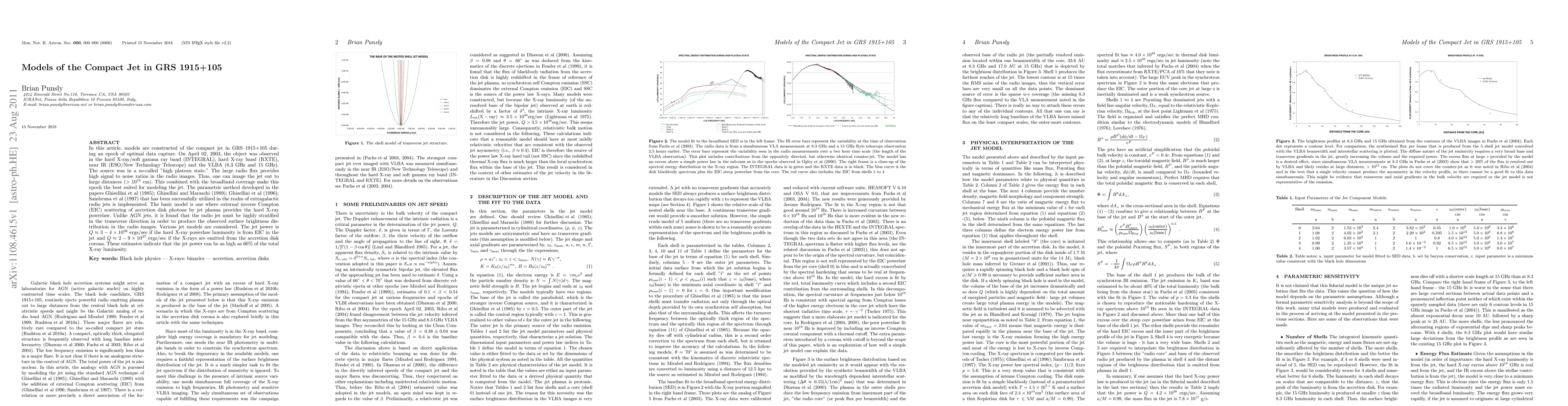 In this article, models are constructed of the compact jet in GRS 1915+105 during an epoch of optimal data capture. On April 02, 2003, the object was observed in the hard X-ray/soft gamma ray band (INTEGRAL), hard X-ray band (RXTE), near IR (ESO/New Technology Telescope) and the VLBA (8.3 GHz and 15 GHz). The source was in a so-called "high plateau state." The large radio flux provides high signal to noise ratios in the radio images. Thus, one can image the jet out to large distances ($ > 10^{15}$ cm). This combined with the broadband coverage make this epoch the best suited for modeling the jet. The parametric method developed in the papers \cite{ghi85,ghi89,ghi96,sam97} that has been successfully utilized in the realm of extragalactic radio jets is implemented. The basic model is one where external inverse Compton (EIC) scattering of accretion disk photons by jet plasma provides the hard X-ray powerlaw. Unlike AGN jets, it is found that the radio jet must be highly stratified in the transverse direction in order to produce the observed surface brightness distribution in the radio images. Various jet models are considered. The jet power is $Q \approx 3-4 \times 10^{38}$ ergs/sec if the hard X-ray powerlaw luminosity is from EIC in the jet and $Q \approx 2 - 9 \times 10^{37}$ ergs/sec if the X-rays are emitted from the accretion disk corona. These estimates indicate that the jet power can be as high as 60% of the total X-ray luminosity.