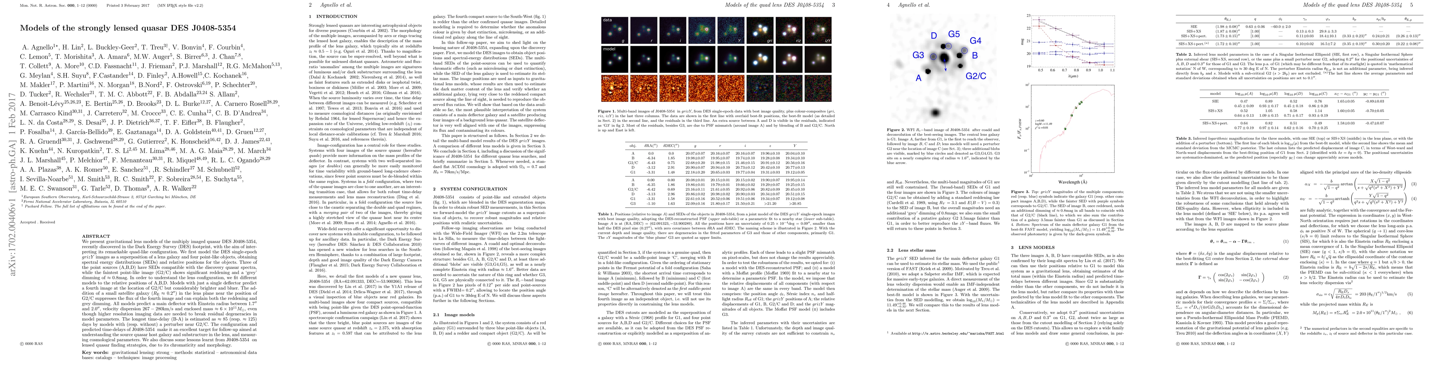 The research presents gravitational lens models for the multiply imaged quasar DES J0408-5354, utilizing DES single-epoch grizY images and spectral energy distributions (SEDs) to determine the lens configuration and properties of the objects.