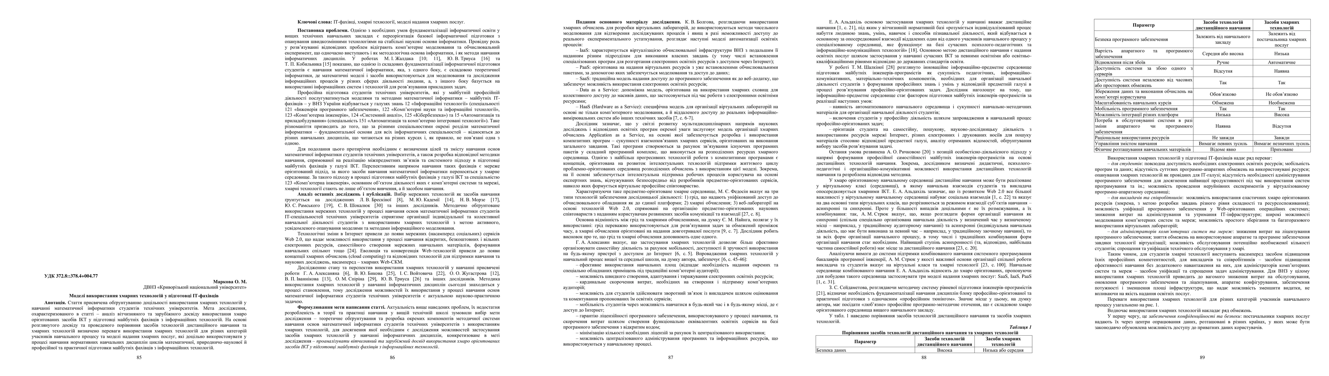 This paper analyzes the integration of cloud technologies in the training of IT professionals, comparing distance and cloud-based learning tools. It identifies the benefits of cloud services for various learning participants and proposes models for using cloud services in teaching mathematical, scientific, and vocational training courses.