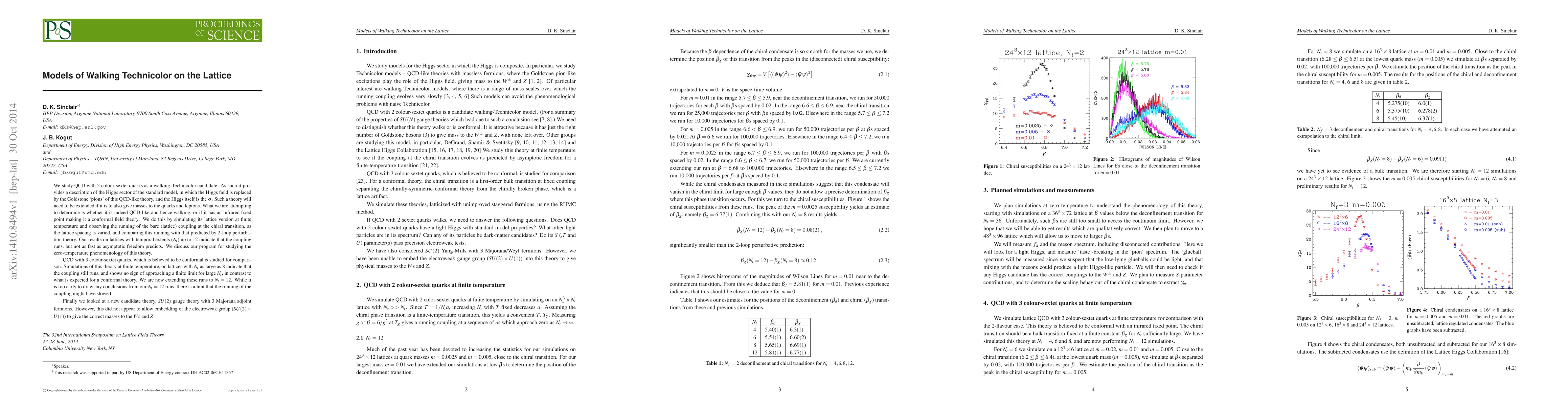 We study QCD with 2 colour-sextet quarks as a walking-Technicolor candidate. As such it provides a description of the Higgs sector of the standard model, in which the Higgs field is replaced by the Goldstone `pions' of this QCD-like theory, and the Higgs itself is the $\sigma$. Such a theory will need to be extended if it is to also give masses to the quarks and leptons. What we are attempting to determine is whether it is indeed QCD-like and hence walking, or if it has an infrared fixed point making it a conformal field theory. We do this by simulating its lattice version at finite temperature and observing the running of the bare (lattice) coupling at the chiral transition, as the lattice spacing is varied, and comparing this running with that predicted by 2-loop perturbation theory. Our results on lattices with temporal extents ($N_t$) up to 12 indicate that the coupling runs, but not as fast as asymptotic freedom predicts. We discuss our program for studying the zero-temperature phenomenology of this theory.