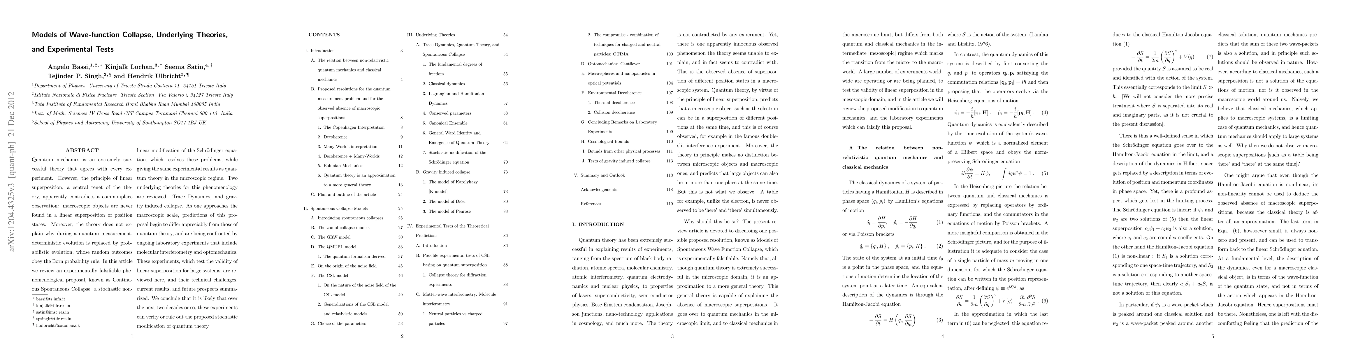Quantum mechanics is an extremely successful theory that agrees with every experiment. However, the principle of linear superposition, a central tenet of the theory, apparently contradicts a commonplace observation: macroscopic objects are never found in a linear superposition of position states. Moreover, the theory does not really explain as to why during a quantum measurement, deterministic evolution is replaced by probabilistic evolution, whose random outcomes obey the Born probability rule. In this article we review an experimentally falsifiable phenomenological proposal, known as Continuous Spontaneous Collapse: a stochastic non-linear modification of the Schr\"{o}dinger equation, which resolves these problems, while giving the same experimental results as quantum theory in the microscopic regime. Two underlying theories for this phenomenology are reviewed: Trace Dynamics, and gravity induced collapse. As one approaches the macroscopic scale, the predictions of this proposal begin to differ appreciably from those of quantum theory, and are being confronted by ongoing laboratory experiments that include molecular interferometry and optomechanics. These experiments, which essentially test the validity of linear superposition for large systems, are reviewed here, and their technical challenges, current results, and future prospects summarized. We conclude that it is likely that over the next two decades or so, these experiments can verify or rule out the proposed stochastic modification of quantum theory.