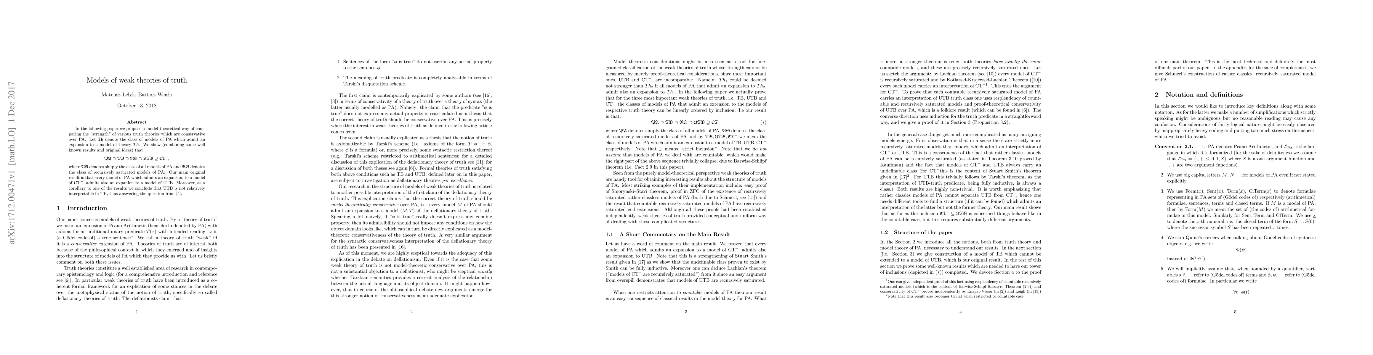 This paper introduces a model-theoretical approach to compare the 'strength' of truth theories conservative over Peano Arithmetic (PA). It establishes a hierarchy of models: PA >= TB >= RS >= UTB >= CT-. A key finding is that any PA model expandable to a CT- model can also be expanded to a UTB model. Furthermore, UTB is proven not relatively interpretable in TB, addressing Fujimoto's question.