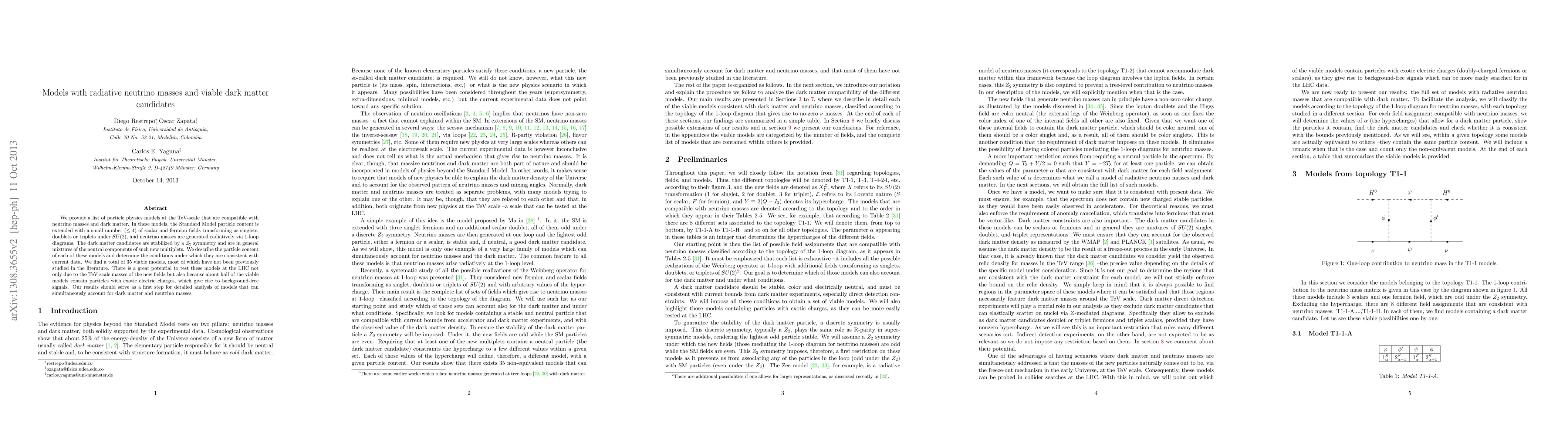 This paper identifies 35 viable TeV-scale particle physics models that incorporate radiative neutrino masses and stable dark matter candidates. These models extend the Standard Model with up to 4 new scalar and fermion fields, and predict dark matter as mixtures of neutral components of new multiplets.