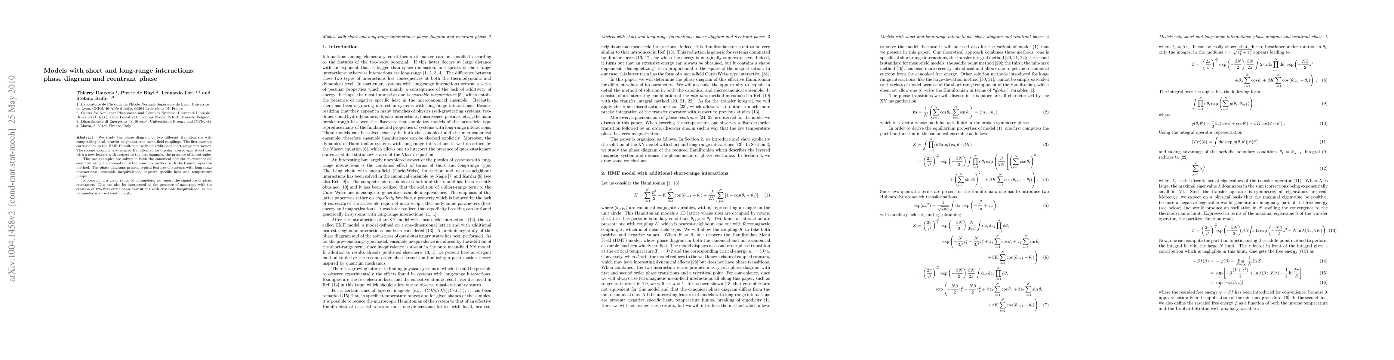 This paper investigates the phase diagrams of two Hamiltonian models featuring both short-range and long-range interactions, revealing ensemble inequivalence, negative specific heat, and temperature jumps. It reports a reentrant phase phenomenon, indicating the presence of azeotropy and two first-order phase transitions.