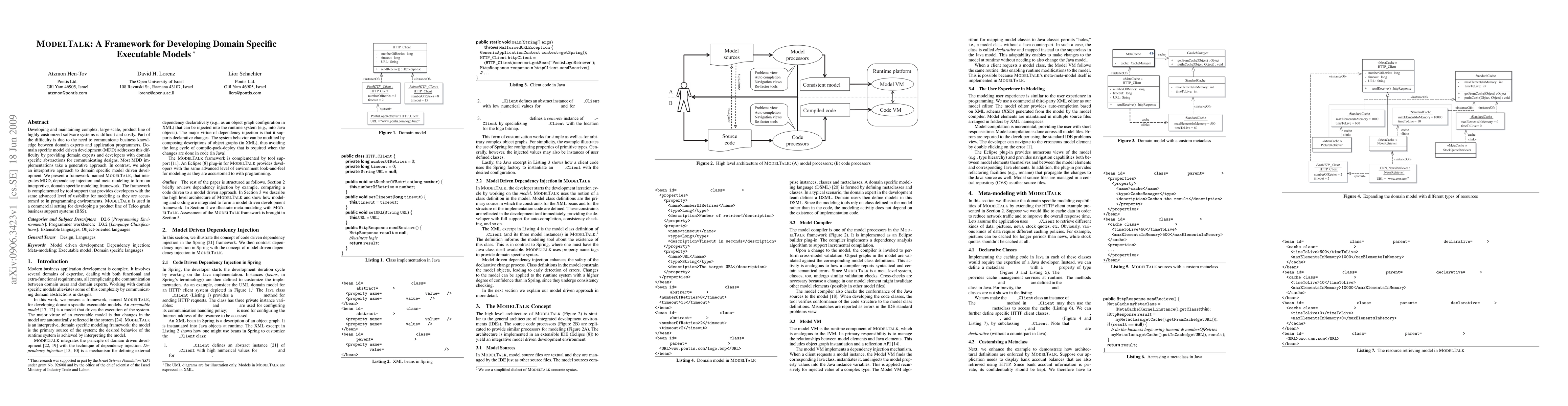 ModelTalk is a framework for developing domain-specific executable models using an interpretive approach, integrating model-driven development, dependency injection, and meta-modeling. It is used in a commercial setting to create a product line of Telco grade business support systems.