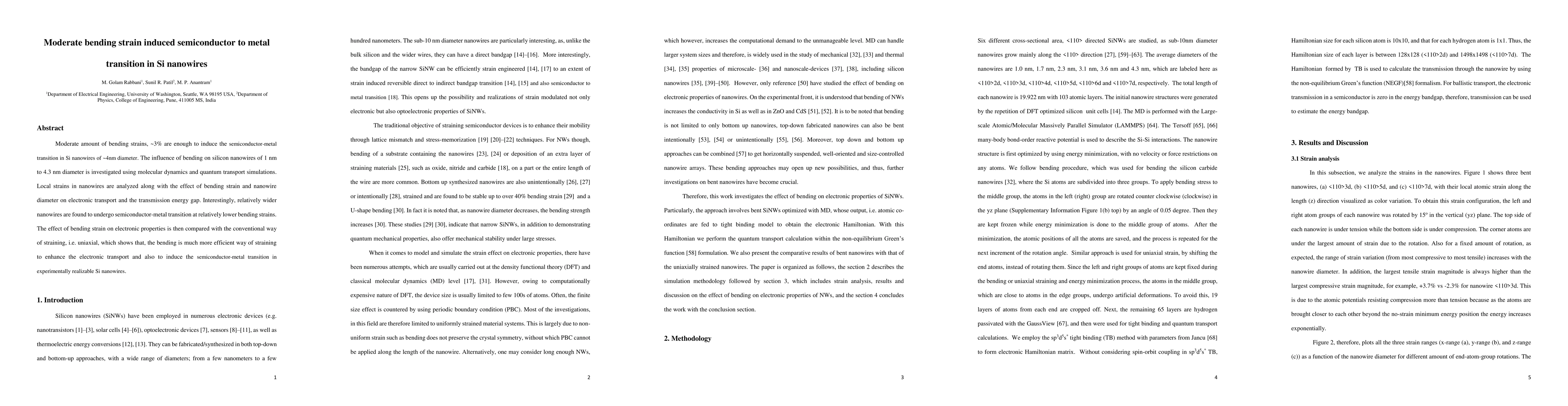 This study investigates how bending strains of approximately 3% can induce a semiconductor-metal transition in silicon nanowires, with diameters ranging from 1 nm to 4.3 nm. The research reveals that wider nanowires transition at lower bending strains, and bending is a more effective strain method than uniaxial strain for enhancing electronic transport and inducing such transitions.