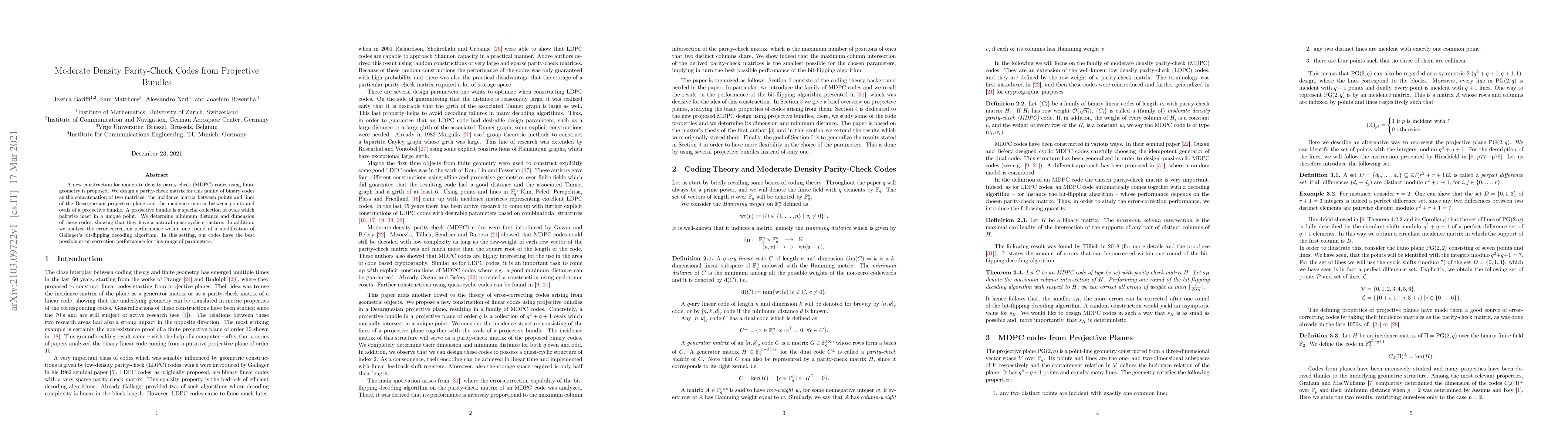 This paper proposes a new construction for moderate density parity-check codes using finite geometry, utilizing incidence matrices from projective planes and bundles. The codes exhibit quasi-cyclic structure, minimum distance, and optimal error-correction performance with a modified Gallager decoding algorithm.