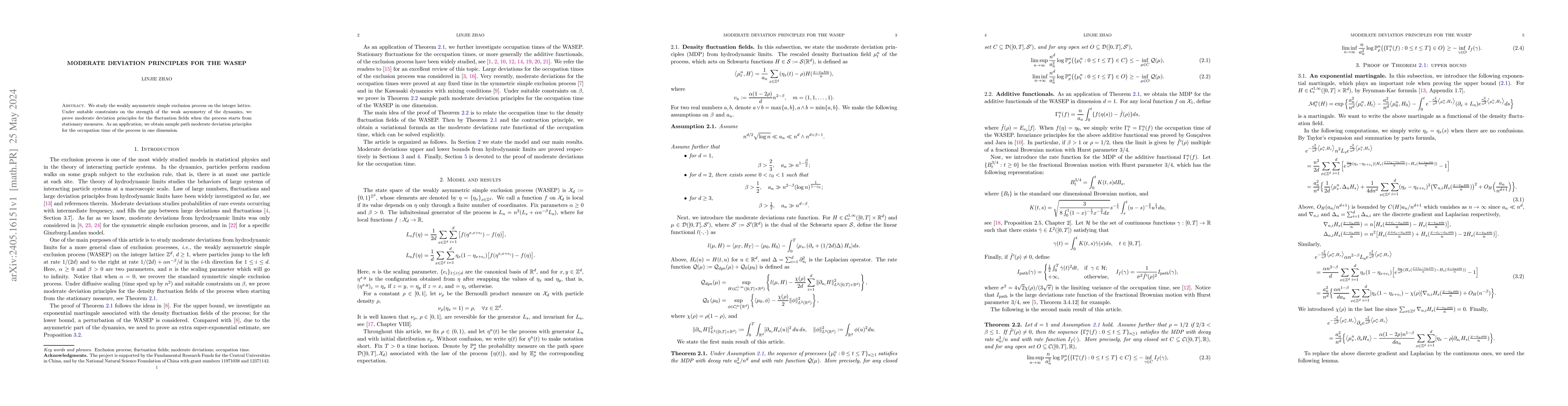 This paper establishes moderate deviation principles for the weakly asymmetric simple exclusion process (WASEP) on the integer lattice, proving that under specific conditions, the fluctuation fields exhibit moderate deviation behavior when initiated from stationary measures, and it applies this to derive sample path moderate deviation principles for the one-dimensional occupation time.