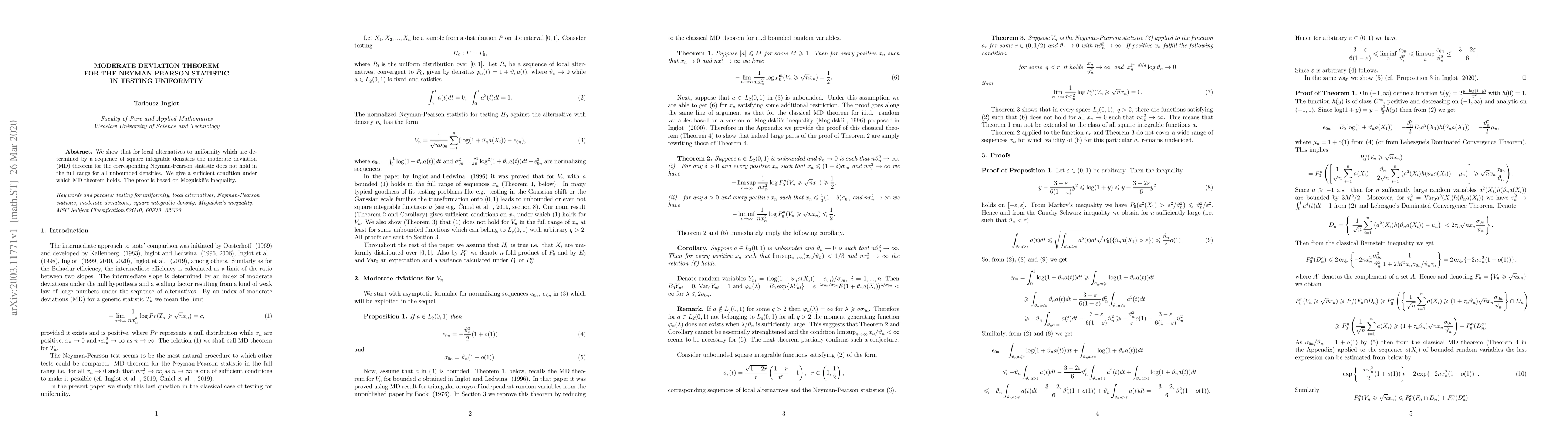 This paper explores the moderate deviation theorem for the Neyman-Pearson statistic in uniformity testing, finding it doesn't apply universally to all unbounded densities. It provides a sufficient condition for the theorem's validity, grounded in Mogulskii's inequality.