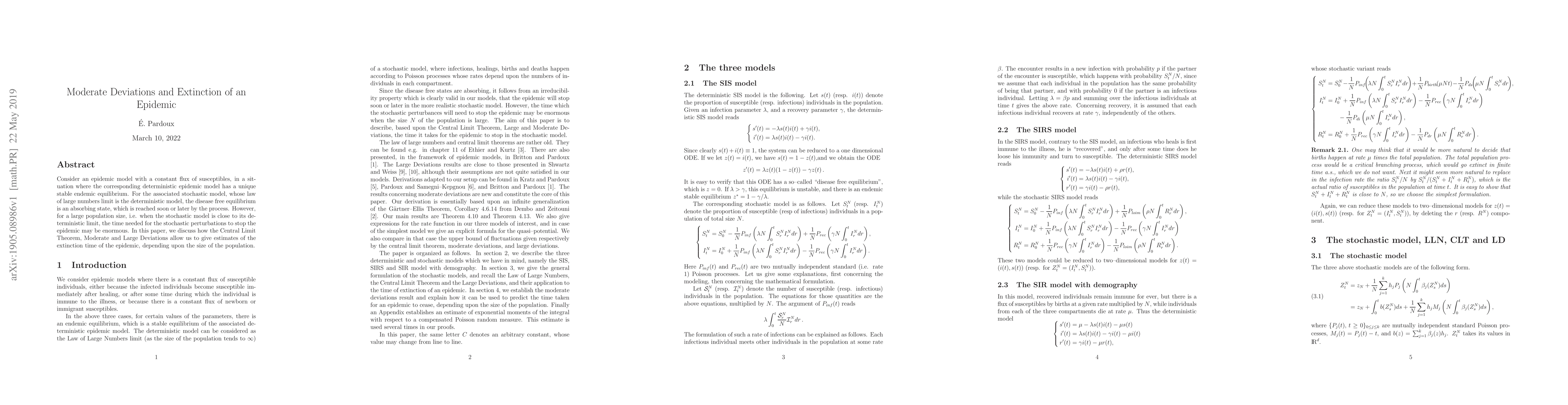 Consider an epidemic model with a constant flux of susceptibles, in a situation where the corresponding deterministic epidemic model has a unique stable endemic equilibrium. For the associated stochastic model, whose law of large numbers limit is the deterministic model, the disease free equilibrium is an absorbing state, which is reached soon or later by the process. However, for a large population size, i.e. when the stochastic model is close to its deterministic limit, the time needed for the stochastic perturbations to stop the epidemic may be enormous. In this paper, we discuss how the Central Limit Theorem, Moderate and Large Deviations allow us to give estimates of the extinction time of the epidemic, depending upon the size of the population.