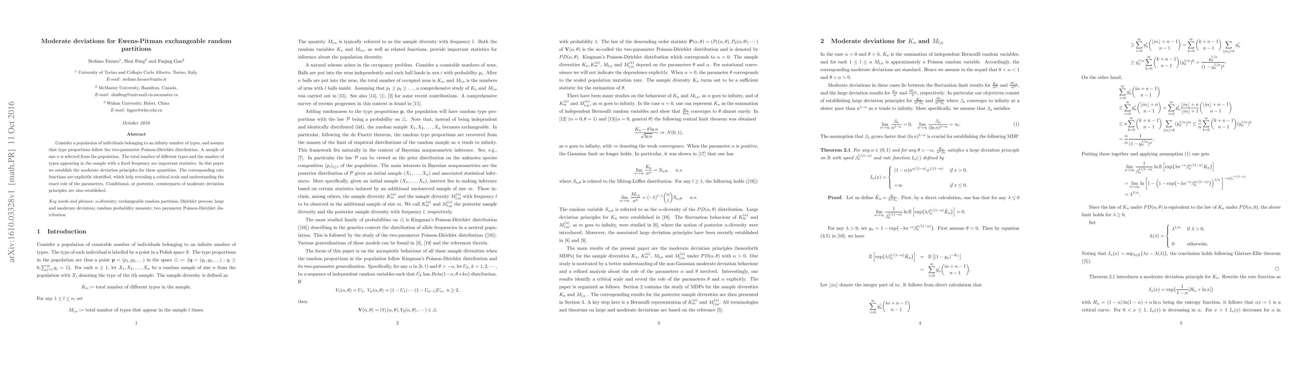 Consider a population of individuals belonging to an infinity number of types, and assume that type proportions follow the two-parameter Poisson-Dirichlet distribution. A sample of size n is selected from the population. The total number of different types and the number of types appearing in the sample with a fixed frequency are important statistics. In this paper we establish the moderate deviation principles for these quantities. The corresponding rate functions are explicitly identified, which help revealing a critical scale and understanding the exact role of the parameters. Conditional, or posterior, counterparts of moderate deviation principles are also established.