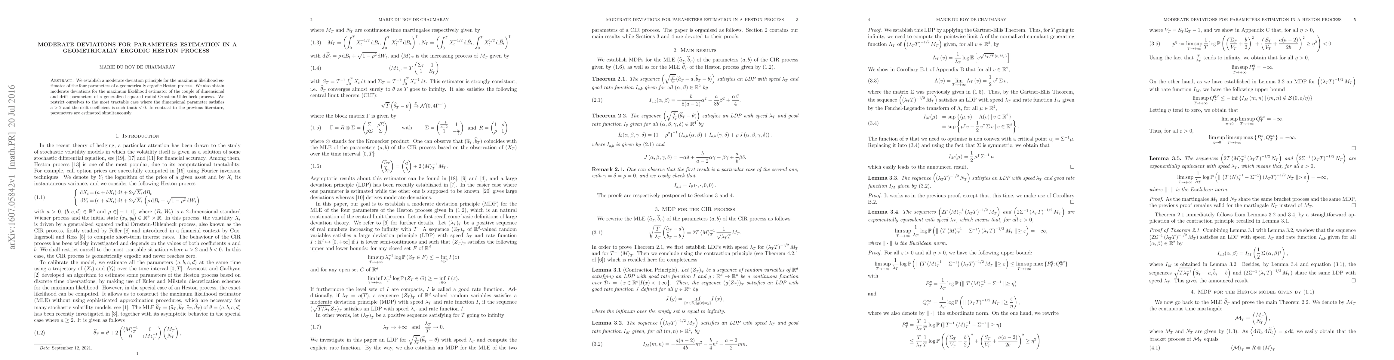 This paper establishes a moderate deviation principle for the maximum likelihood estimator of parameters in a geometrically ergodic Heston process, with simultaneous estimation of all parameters. It also extends the analysis to a generalized squared radial Ornstein-Uhlenbeck process under specific conditions on parameters.