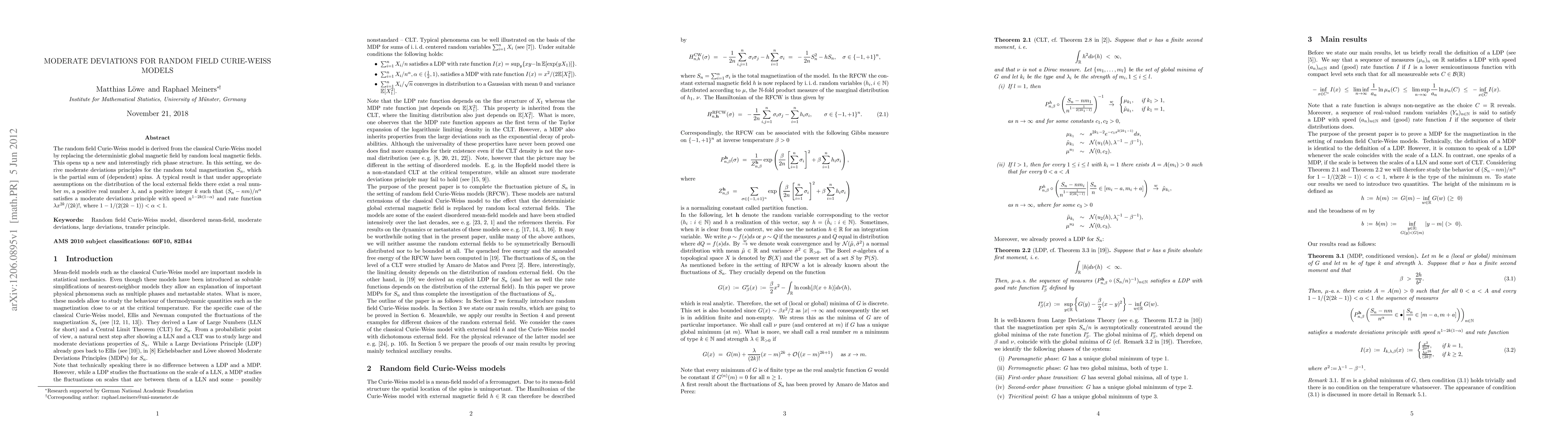 The paper presents detailed derivations of moderate deviations principles for random field Curie-Weiss models, including conditions under which these principles hold and the specific forms of the rate functions.
