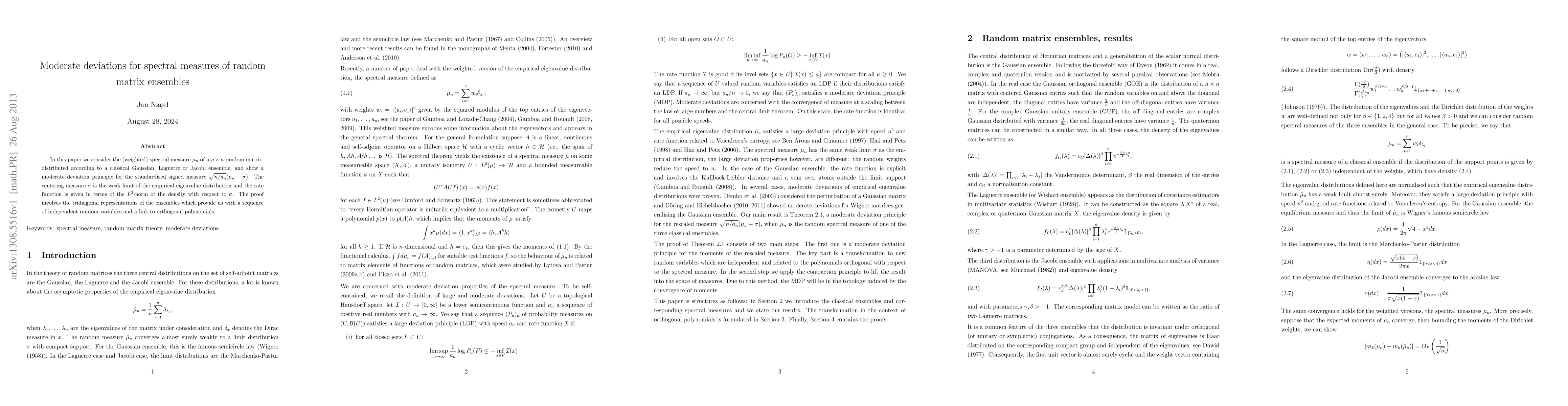 In this paper we consider the (weighted) spectral measure $\mu_n$ of a $n\times n$ random matrix, distributed according to a classical Gaussian, Laguerre or Jacobi ensemble, and show a moderate deviation principle for the standardised signed measure $\sqrt{n/a_n}(\mu_n -\sigma)$. The centering measure $\sigma$ is the weak limit of the empirical eigenvalue distribution and the rate function is given in terms of the $L^2$-norm of the density with respect to $\sigma$. The proof involves the tridiagonal representations of the ensembles which provide us with a sequence of independent random variables and a link to orthogonal polynomials.