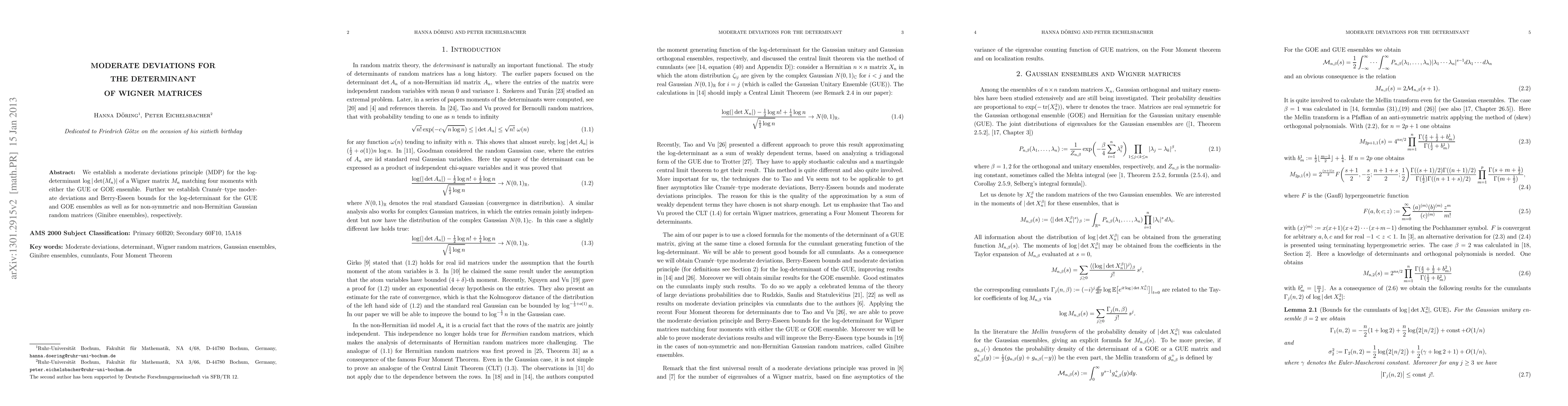 This paper establishes a moderate deviations principle for the log-determinant of Wigner matrices, matching four moments to either GUE or GOE ensembles, and provides Cramér-type moderate deviations and Berry-Esseen bounds for the GUE, GOE, and Ginibre ensembles.