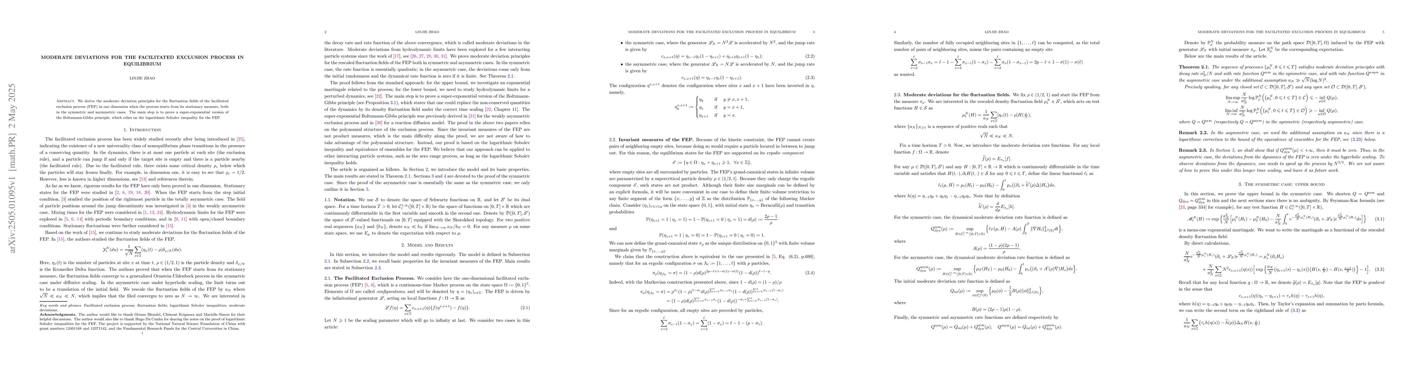 Summary: This paper establishes moderate deviation principles for the fluctuation fields of the one-dimensional facilitated exclusion process starting from equilibrium, proving a super-exponential version of the Boltzmann-Gibbs principle through the logarithmic Sobolev inequality.