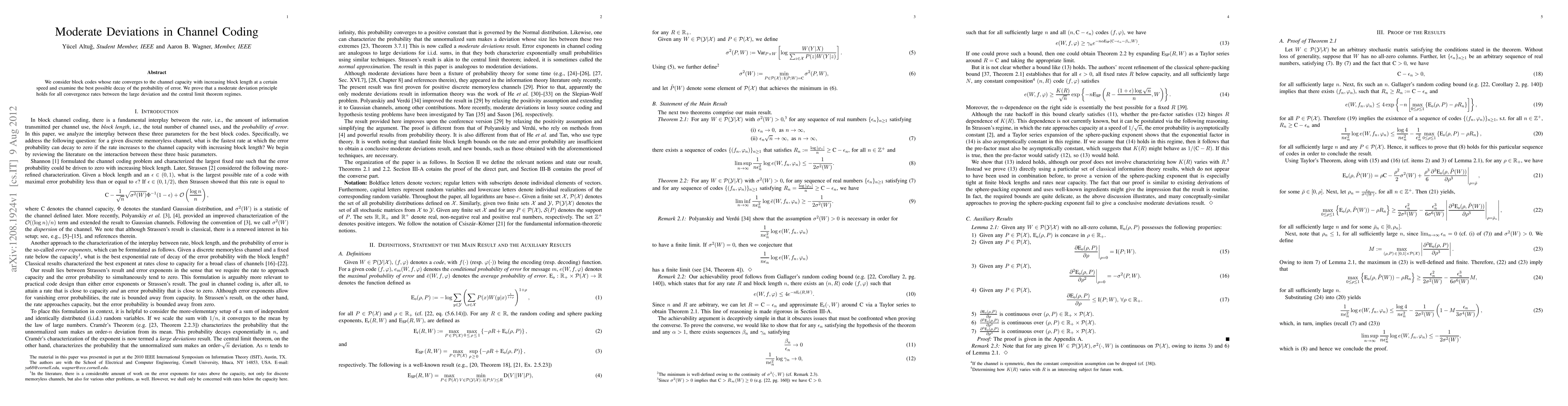 We consider block codes whose rate converges to the channel capacity with increasing block length at a certain speed and examine the best possible decay of the probability of error. We prove that a moderate deviation principle holds for all convergence rates between the large deviation and the central limit theorem regimes.