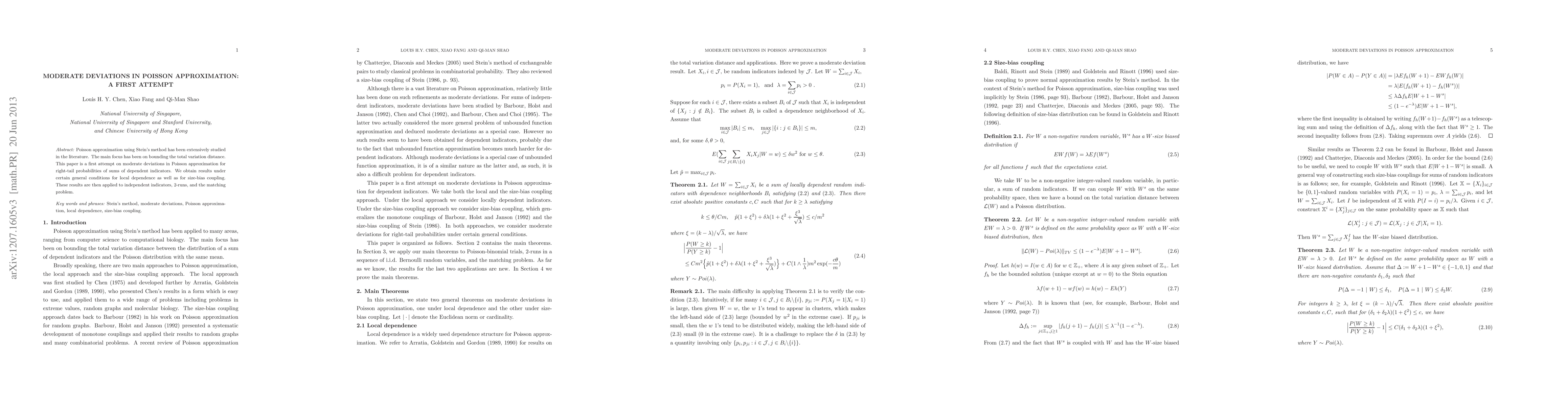 This paper explores moderate deviations in Poisson approximation for right-tail probabilities of sums of dependent indicators, applying results under general local dependence and size-bias coupling conditions to independent indicators, 2-runs, and the matching problem.