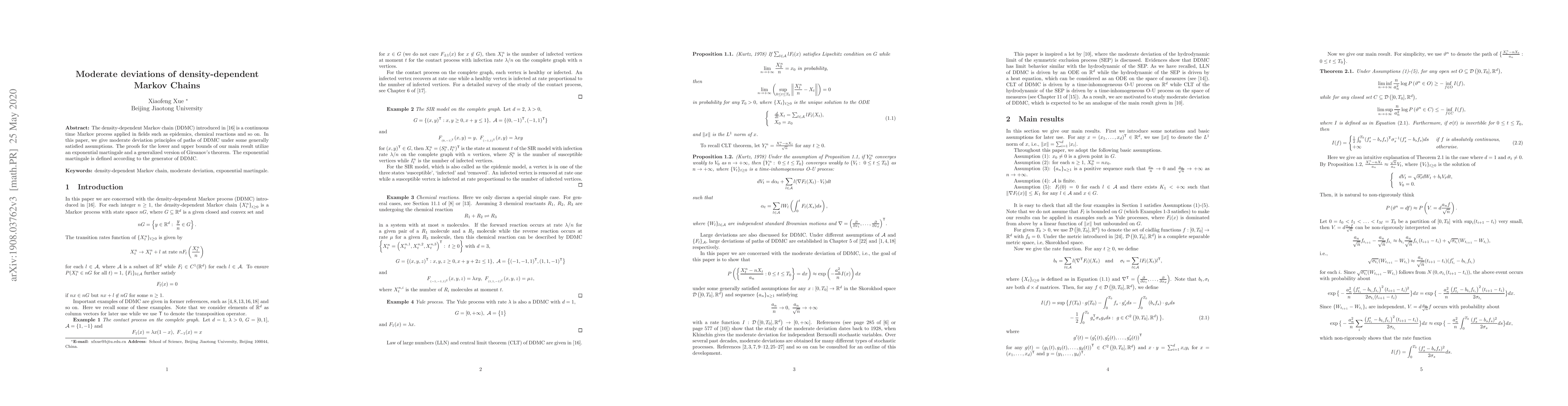 This paper investigates moderate deviation principles for density-dependent Markov chains (DDMC), presenting lower and upper bounds proofs via an exponential martingale and a generalized Girsanov's theorem, defined relative to the DDMC generator.