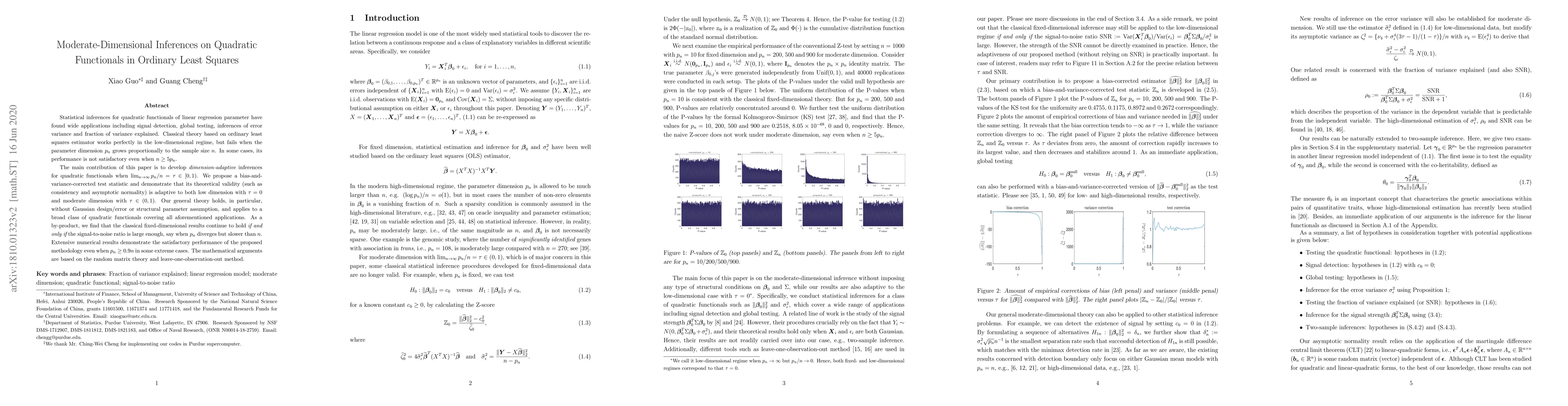 Statistical inferences for quadratic functionals of linear regression parameter have found wide applications including signal detection, global testing, inferences of error variance and fraction of variance explained. Classical theory based on ordinary least squares estimator works perfectly in the low-dimensional regime, but fails when the parameter dimension $p_n$ grows proportionally to the sample size $n$. In some cases, its performance is not satisfactory even when $n\ge 5p_n$. The main contribution of this paper is to develop {\em dimension-adaptive} inferences for quadratic functionals when $\lim_{n\to \infty} p_n/n=\tau\in[0,1)$. We propose a bias-and-variance-corrected test statistic and demonstrate that its theoretical validity (such as consistency and asymptotic normality) is adaptive to both low dimension with $\tau = 0$ and moderate dimension with $\tau \in(0, 1)$. Our general theory holds, in particular, without Gaussian design/error or structural parameter assumption, and applies to a broad class of quadratic functionals covering all aforementioned applications. As a by-product, we find that the classical fixed-dimensional results continue to hold {\em if and only if} the signal-to-noise ratio is large enough, say when $p_n$ diverges but slower than $n$. Extensive numerical results demonstrate the satisfactory performance of the proposed methodology even when $p_n\ge 0.9n$ in some extreme cases. The mathematical arguments are based on the random matrix theory and leave-one-observation-out method.