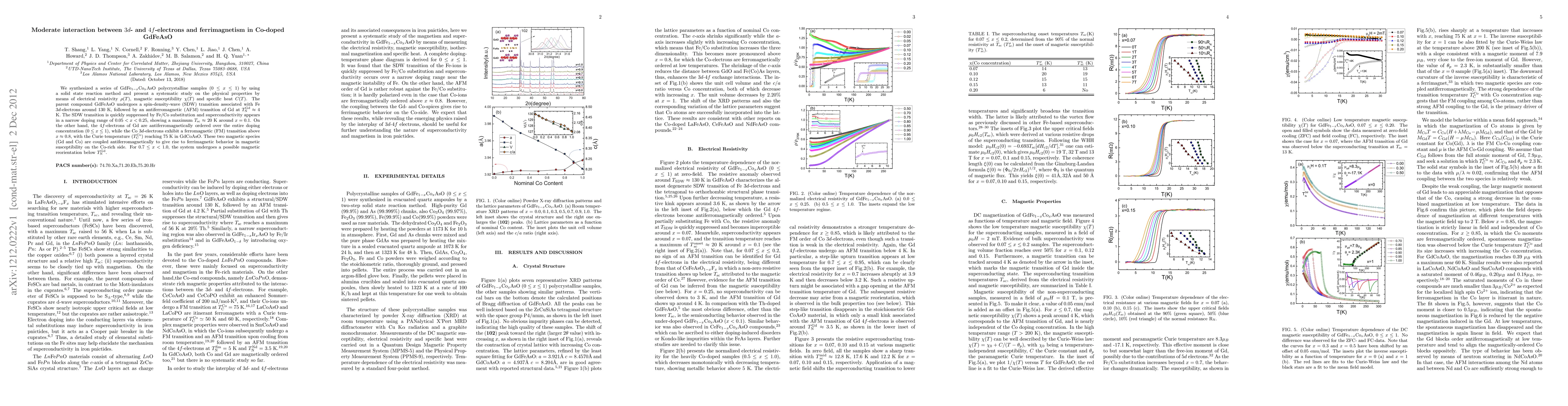 This study investigates the interplay between 3d-electrons in Co and 4f-electrons in Gd in Co-doped GdFeAsO, revealing ferrimagnetism due to antiferromagnetic coupling between the two magnetic species. The suppression of spin-density wave transitions and emergence of superconductivity with moderate doping are also reported.