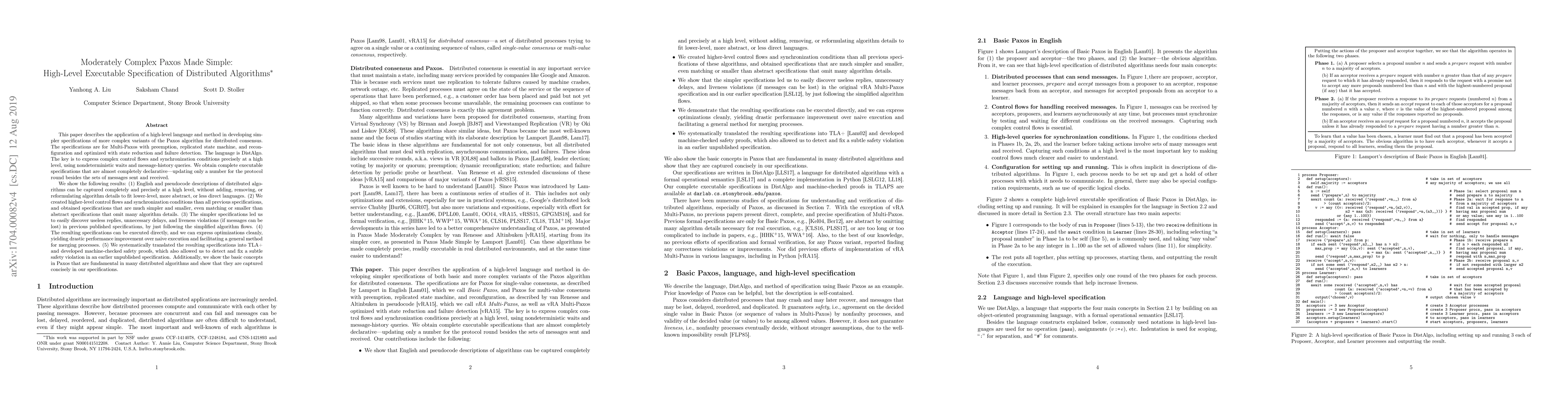 This paper presents a high-level language, DistAlgo, for developing simpler and more precise specifications of complex Paxos variants, including Multi-Paxos with preemption and reconfiguration. The paper demonstrates that these specifications can be easily executed, optimized, and translated into TLA+ for machine-checked safety proofs, leading to performance improvements and the discovery of flaws in previous specifications.