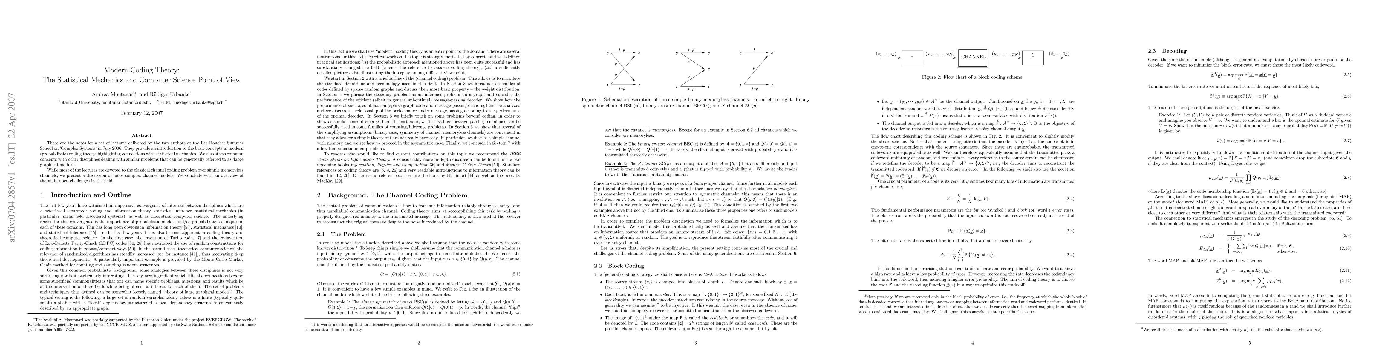 This paper introduces modern probabilistic coding theory, emphasizing its connections to statistical mechanics and large graphical models. It covers classical channel coding problems and more complex channel models, while highlighting ongoing challenges in the field.