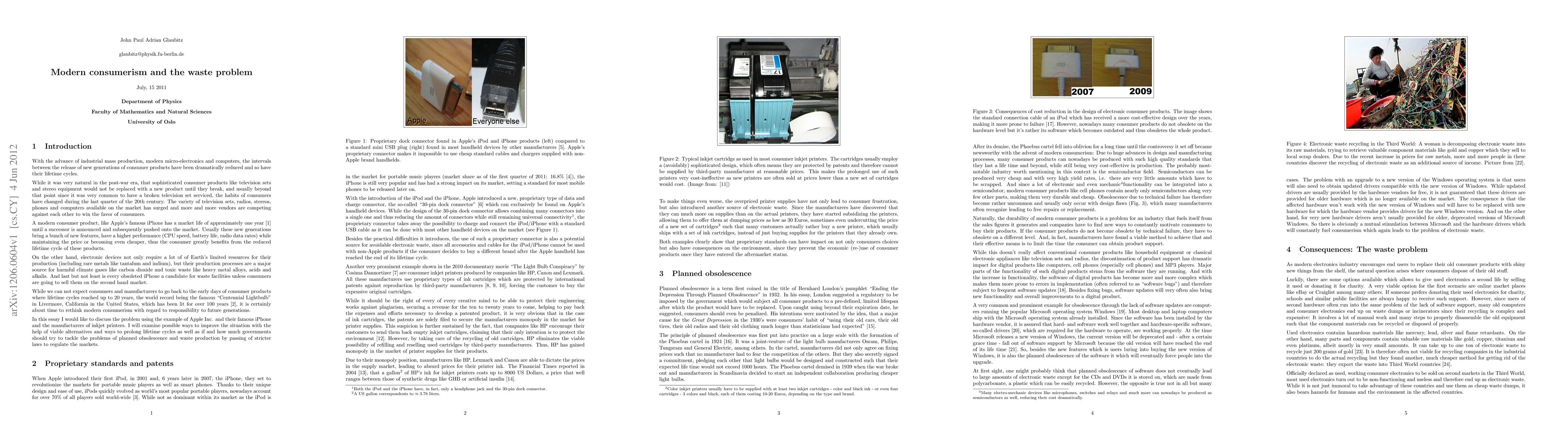 With the advance of industrial mass production, modern micro-electronics and computers, the intervals between the release of new generations of consumer products have been dramatically reduced and so have their lifetime cycles. While it was very natural in the post-war era, that sophisticated consumer products like television sets and stereo equipment would not be replaced with a new product until they break, and usually beyond that point since it was very common to have a broken television set serviced, the habits of consumers have changed during the last quarter of the 20th century. A modern consumer product, like Apple's famous iPhone has a market life of approximately one year until a successor is announced and subsequently pushed into the market. Usually these new generations bring a bunch of new features, have a higher performance while maintaining the price or becoming even cheaper, thus the consumer greatly benefits from the reduced lifetime cycle of these products. However, electronic devices not only require a lot of of Earth's limited resources for their production, but their production processes are a major source for harmful climate gases like carbon dioxide and toxic waste like heavy metal alloys, acids and alkalis. And last but not least is every obsoleted iPhone a candidate for waste facilities unless consumers are going to sell them on the second hand market. While we can not expect consumers and manufacturers to go back to the early days of consumer products where lifetime cycles reached up to 20 years, the world record being the famous "Centennial Lightbulb" in Livermore, CA in the US, which has been lit for over 100 years, it is certainly about time to rethink modern consumerism with regard to responsibility to future generations.