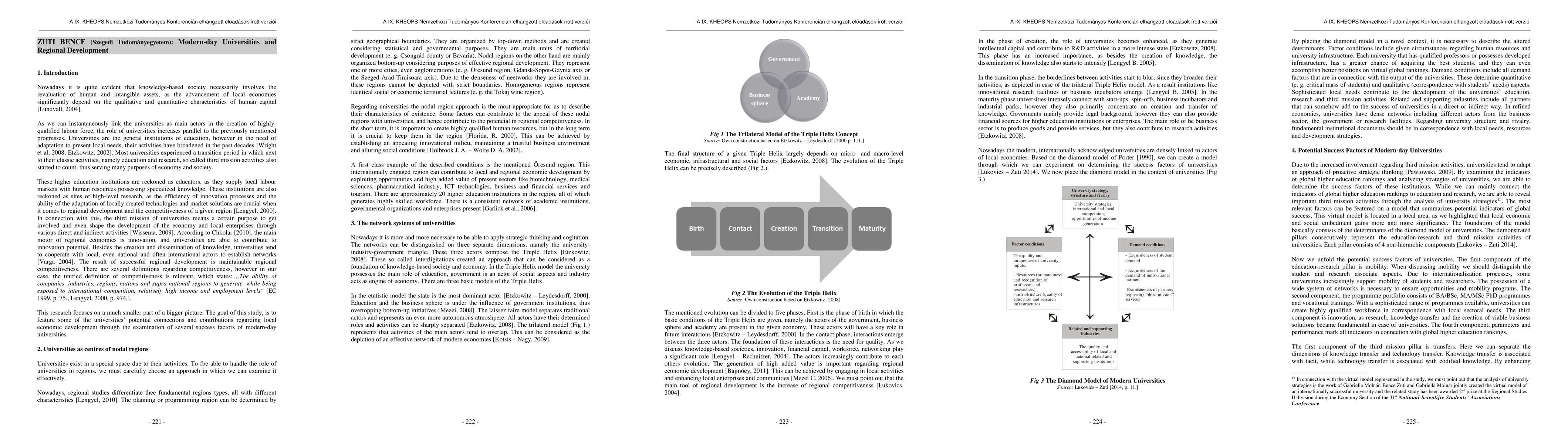 Nowadays it is quite evident that knowledge-based society necessarily involves the revaluation of human and intangible assets, as the advancement of local economies significantly depend on the qualitative and quantitative characteristics of human capital[Lundvall, 2004]. As we can instantaneously link the universities as main actors in the creation of highly-qualified labour force, the role of universities increases parallel to the previously mentioned progresses. Universities are the general institutions of education, however i nthe need of adaptation to present local needs, their activities have broadened in the past decades [Wright et al, 2008; Etzkowitz, 2002]. Most universities experienced a transition period in which next to their classic activities, namely education and research, so called third mission activities also started to count, thus serving many purposes of economy and society.