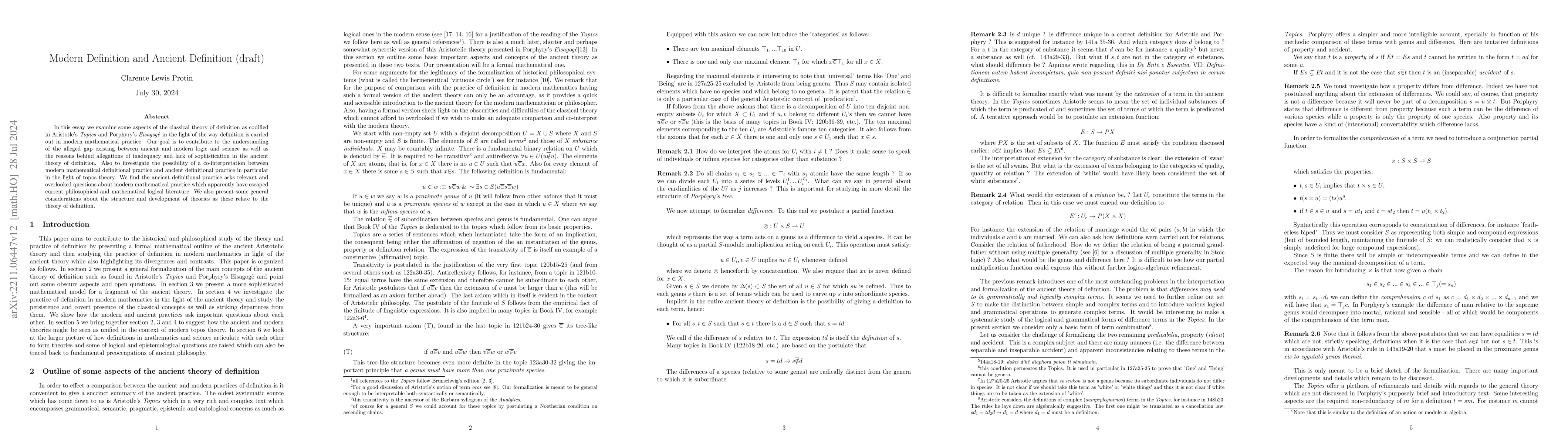 This paper explores the classical theory of definition from Aristotle and Porphyry, comparing it with modern mathematical definitions to bridge the perceived gap between ancient and contemporary logic and science, while highlighting overlooked questions ancient theory poses for modern practice.