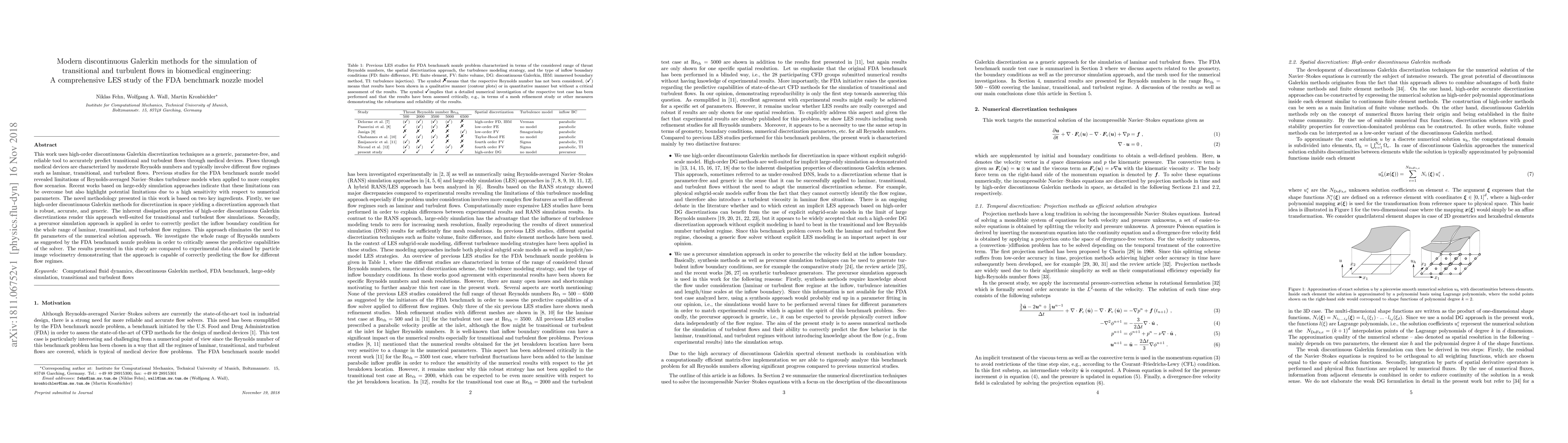 This paper employs high-order discontinuous Galerkin methods for simulating transitional and turbulent flows through medical devices, demonstrating their accuracy and robustness without requiring parameter fitting. The study validates the methodology against experimental data for the FDA benchmark nozzle model across various Reynolds numbers.