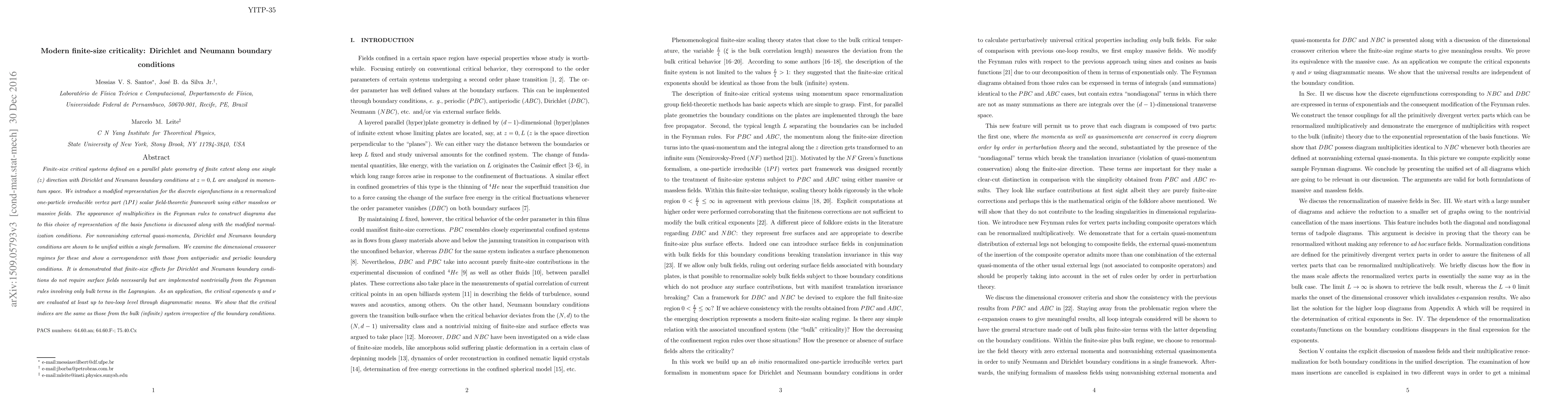 This paper analyzes finite-size critical systems on parallel plate geometries with Dirichlet and Neumann boundary conditions, employing a modified representation for eigenfunctions in a scalar field theory framework. It demonstrates that finite-size effects arise from bulk terms and not necessarily from surface fields, and evaluates critical exponents $\eta$ and $\nu$ up to two-loop level, showing they match those of the bulk system.