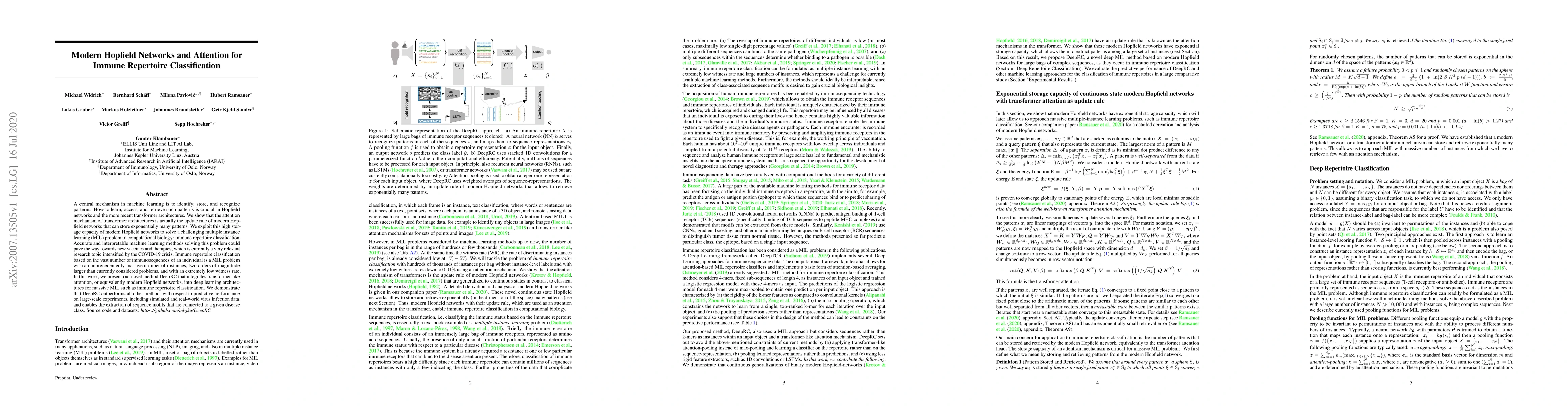 A central mechanism in machine learning is to identify, store, and recognize patterns. How to learn, access, and retrieve such patterns is crucial in Hopfield networks and the more recent transformer architectures. We show that the attention mechanism of transformer architectures is actually the update rule of modern Hopfield networks that can store exponentially many patterns. We exploit this high storage capacity of modern Hopfield networks to solve a challenging multiple instance learning (MIL) problem in computational biology: immune repertoire classification. Accurate and interpretable machine learning methods solving this problem could pave the way towards new vaccines and therapies, which is currently a very relevant research topic intensified by the COVID-19 crisis. Immune repertoire classification based on the vast number of immunosequences of an individual is a MIL problem with an unprecedentedly massive number of instances, two orders of magnitude larger than currently considered problems, and with an extremely low witness rate. In this work, we present our novel method DeepRC that integrates transformer-like attention, or equivalently modern Hopfield networks, into deep learning architectures for massive MIL such as immune repertoire classification. We demonstrate that DeepRC outperforms all other methods with respect to predictive performance on large-scale experiments, including simulated and real-world virus infection data, and enables the extraction of sequence motifs that are connected to a given disease class. Source code and datasets: https://github.com/ml-jku/DeepRC
