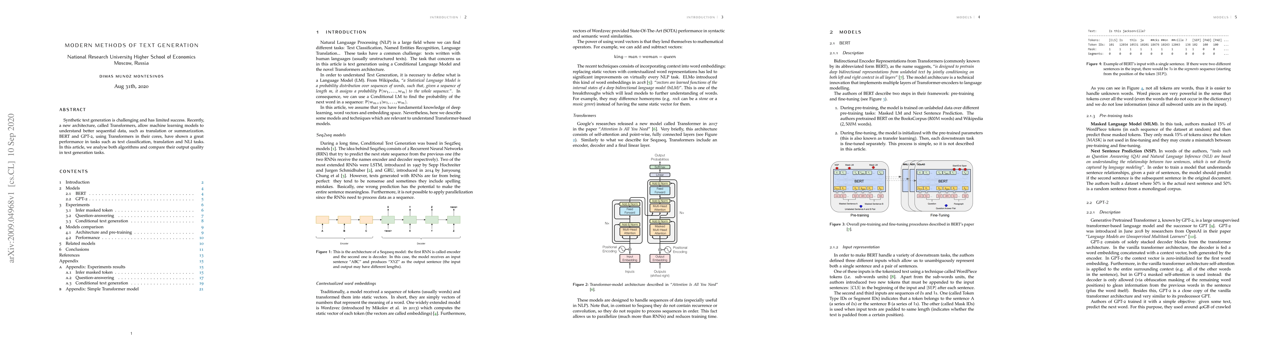 Synthetic text generation is challenging and has limited success. Recently, a new architecture, called Transformers, allow machine learning models to understand better sequential data, such as translation or summarization. BERT and GPT-2, using Transformers in their cores, have shown a great performance in tasks such as text classification, translation and NLI tasks. In this article, we analyse both algorithms and compare their output quality in text generation tasks.