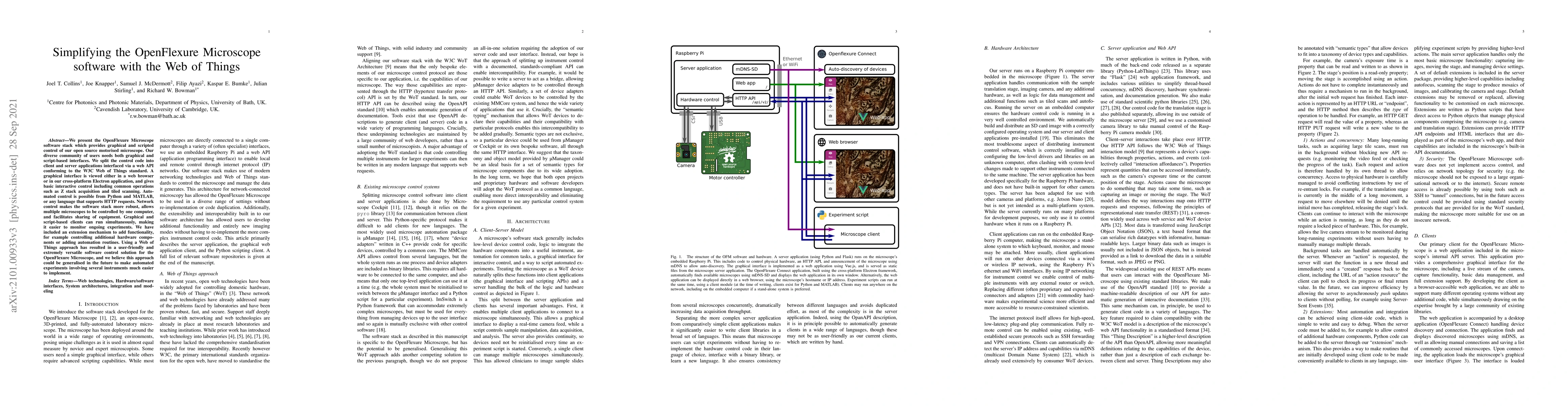 Automated and computerised control of scientific instrumentation is almost ubiquitous in the modern laboratory. Most instrumentation is controlled over decades old communication busses or is accessed via proprietary system libraries. This limits which languages and operating systems can be used to control instruments, and poses a significant problem when interfacing multiple instruments into the same experiment. Here we present the OpenFlexure Microscope software stack as an example of how a scientific instrument can be controlled using existing, cross-platform, language-independent, industry-supported standards. We split the control code into client and server applications interfaced via a web API that conforms to the W3C Web of Things standard. This enables simple control of the microscope from multiple languages, provides a modern graphical control interface, and minimises duplicated code. Network control also makes the software stack more robust, allows multiple microscopes to be controlled by one computer, and facilitates sharing of equipment between local or remote users. Using a Web of Things approach in research laboratories has the potential to solve many of the key challenges of experiment integration, using technology that is already well established.