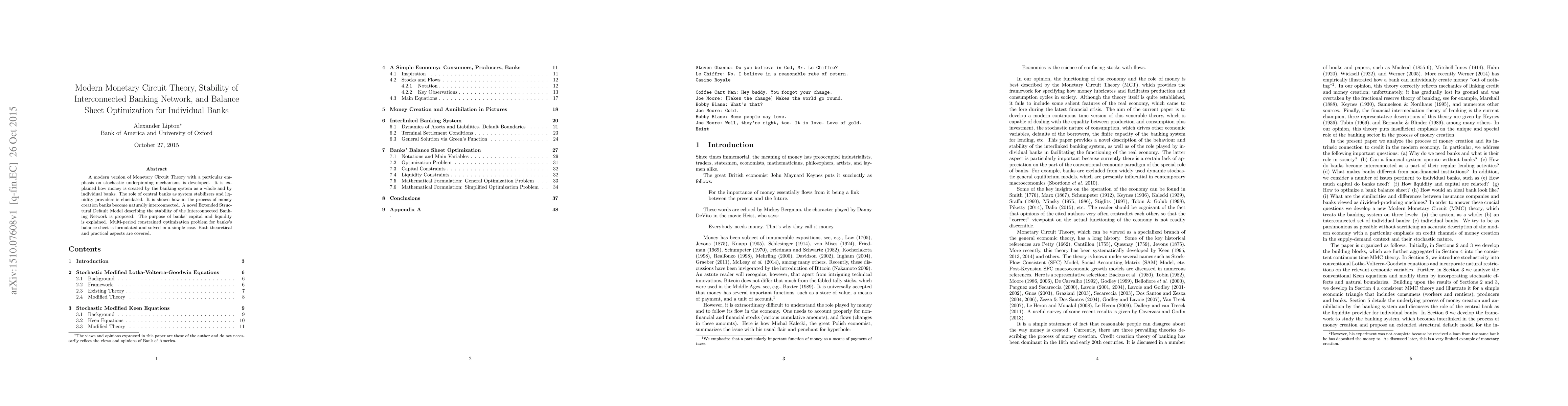 This paper develops a modern Monetary Circuit Theory focusing on the stochastic mechanisms of money creation by the banking system, emphasizing the role of central banks in stability. It introduces an Extended Structural Default Model to analyze the stability of interconnected banking networks and formulates a multi-period optimization problem for individual banks' balance sheet management.