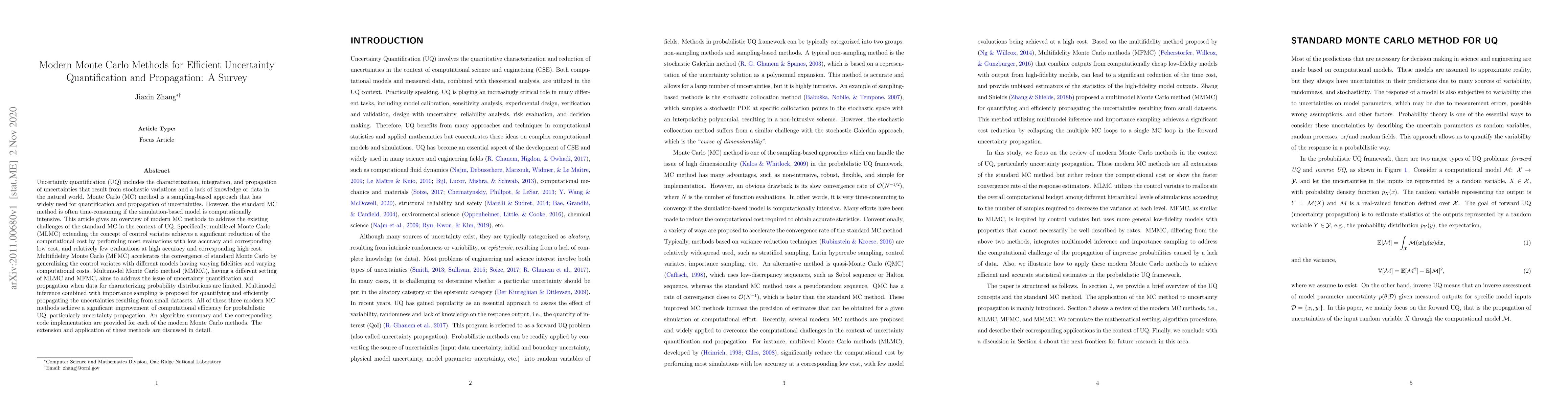 This paper surveys modern Monte Carlo methods—including multilevel, multifidelity, and multimodel Monte Carlo—to enhance computational efficiency in uncertainty quantification and propagation. These methods reduce computational costs by optimizing the balance between low-cost, low-accuracy evaluations and high-cost, high-accuracy evaluations, addressing challenges faced by the standard Monte Carlo approach.